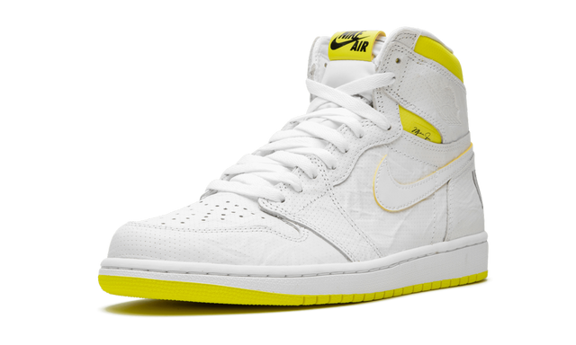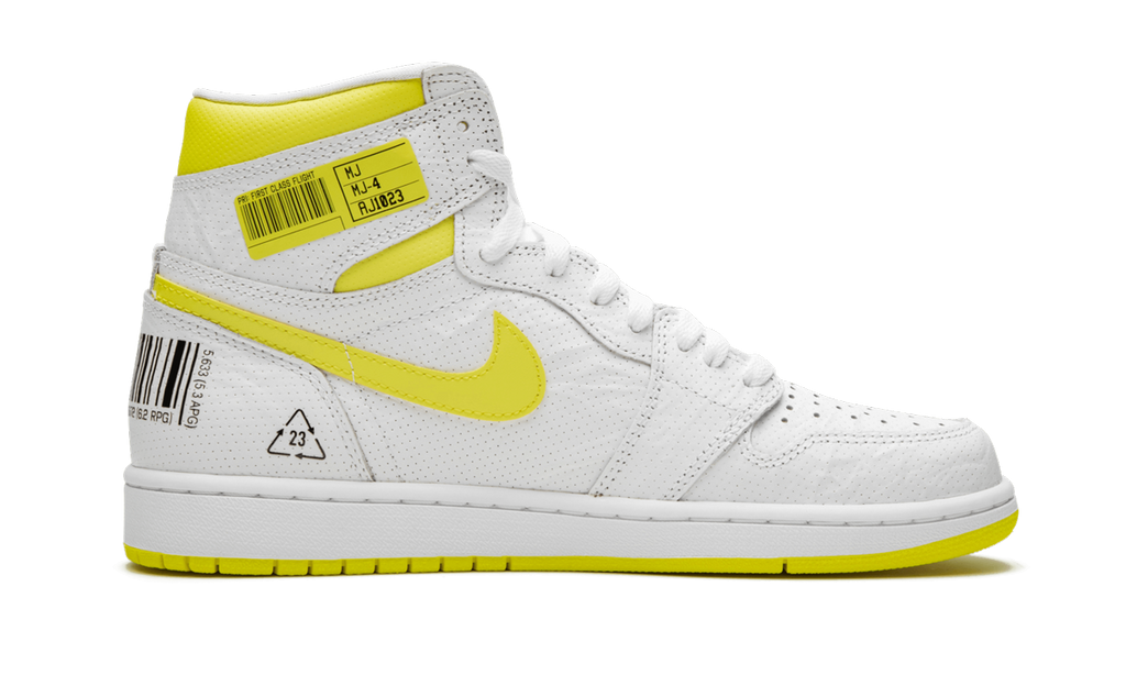 The Air Jordan 1 High “First Class Flight” draws inspiration from an unlikely place; Nike’s shipping department. Honoring the too-often overlooked efforts of the men and women who deliver, receive, and sort Nike’s immense catalog of products, the “First Class Flight” Air Jordan 1 is awash with unique details as an ode to the hardworking group. Covering the upper is a white leather base with a tonal white leather Swoosh with a yellow leather backing. The medial Swoosh is composed of yellow leather and adds an element of contrast to the design. Other key aspects sprinkled throughout the upper include black barcodes on both heels, with a mini black safety icon with Jordan’s “23” on the lateral panel. Another barcode is found on the medial side of the ankle collar. Finishing touches include a yellow Nike Air branding tab on the tongue, Michael Jordan’s signature in black text over a yellow overlay on the ankle, and a white rubber midsole and vibrant yellow outsole. Release date: September 28, 2019