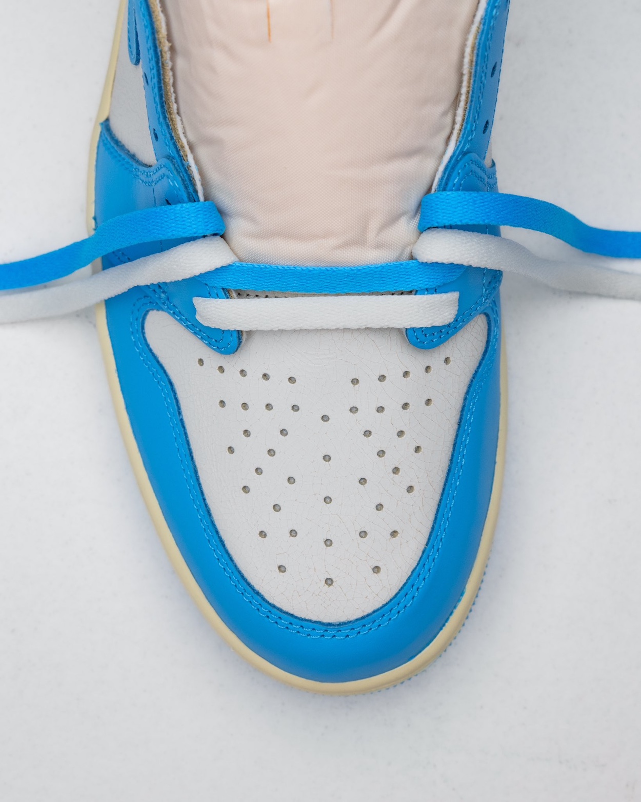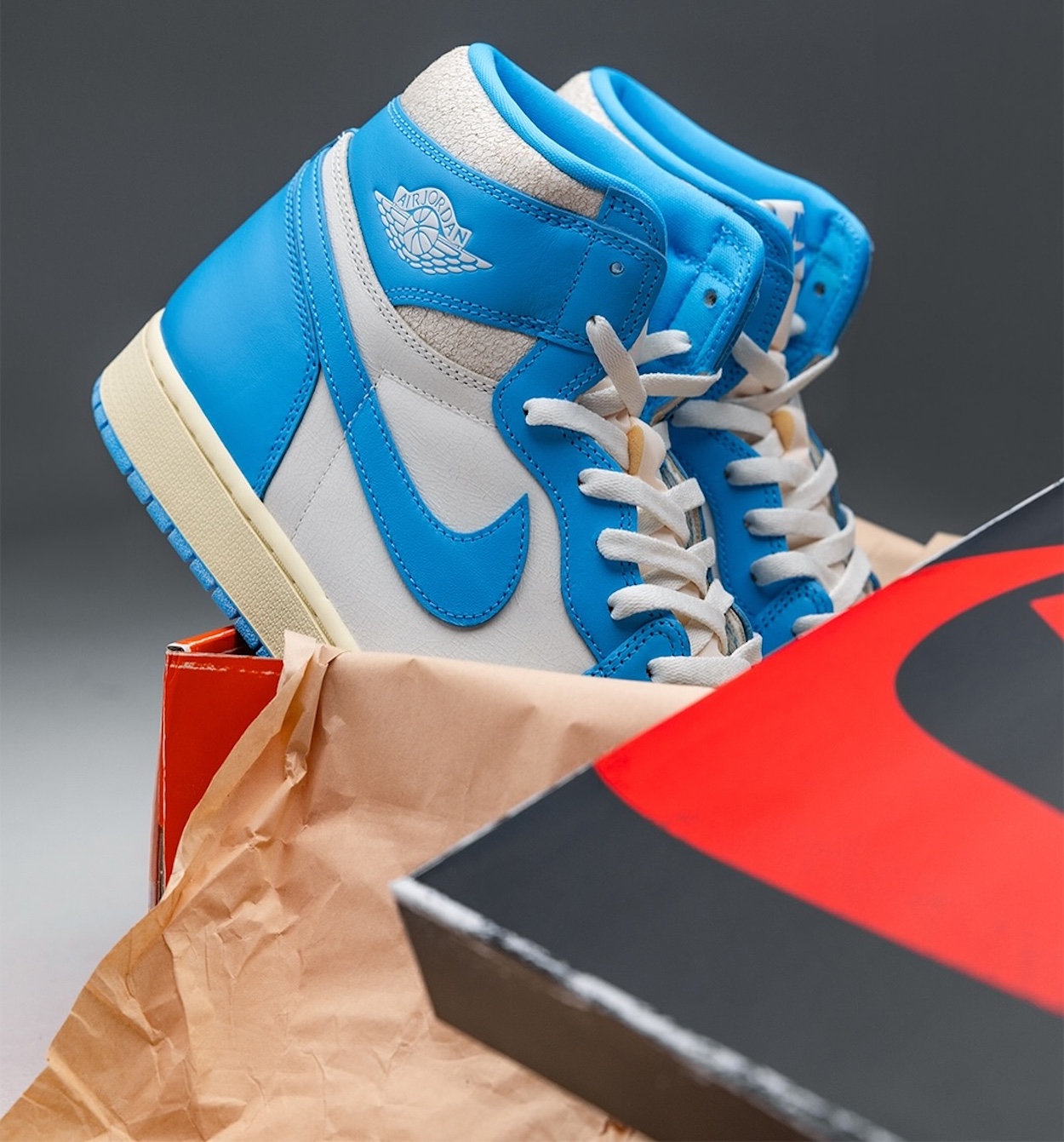 The Air Jordan 1 High “UNC Reimagined” offers a fresh look at Michael Jordan’s first signature shoe. The UNC AJ1 adds the Reimagined design cues to the high top Jordan 1 that honors MJ’s alma mater, the University of North Carolina. Featuring a crisp Carolina blue and white upper, the “UNC Reimagined” Jordan 1 has vintage details like an off-white midsole and cracked leather around the ankle.