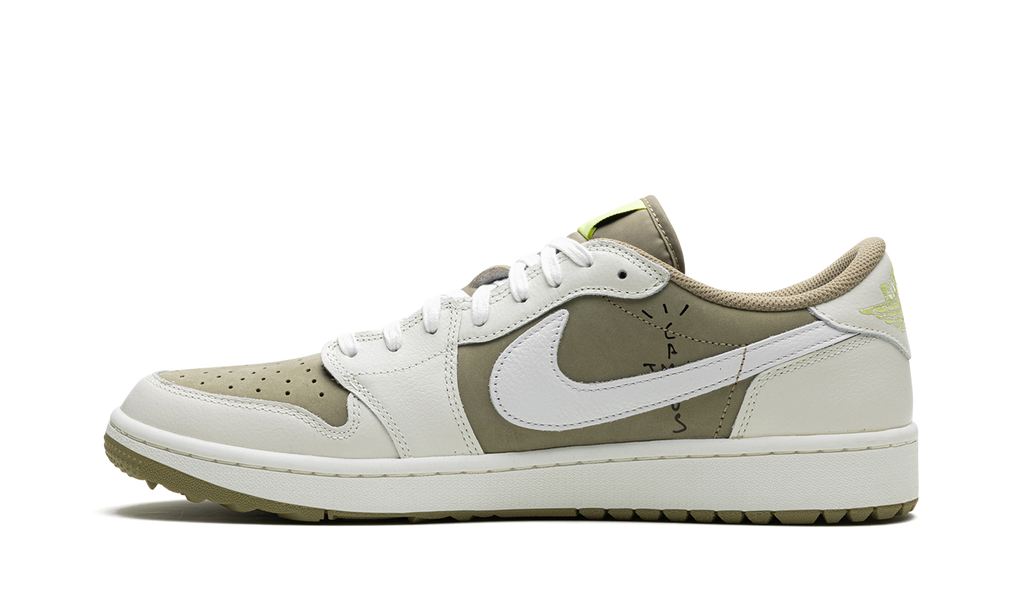 The Travis Scott x Air Jordan 1 Low Golf “Neutral Olive” is a collaboration by the rap superstar on the alternate golf version of the retro basketball sneaker. Travis Scott’s Jordan 1 Low Golf is the follow-up to the Texas native’s other sought after Air Jordan 1 collaborations that date back to 2019. Here, Scott adds his signature aesthetic to the Jordan 1 Low Golf, marking the first time that the hip-hop artist has released a golf sneaker. The “Neutral Olive” features a similar color scheme to the Women’s Jordan 1 Low OG “Olive” in that it features a neutral-colored base with contrasting white leather overlays. Here, Neutral Olive forms the base with contrasting white leather overlays. An oversized and inverted black Swoosh appears on the lateral side while a white leather Jumpman lands on the medial side. A Jumpman Golf logo is seen on the tongue tag next to a “Cactus Jack” logo.