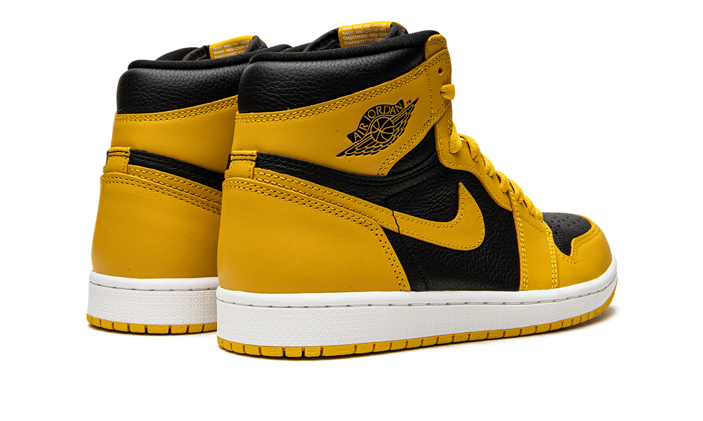 In a simple two-tone format, the upper of the Air Jordan 1 High Pollen is constructed of black tumbled leather with Pollen Yellow overlays and Swooshes. Matching woven tongue tags and a Jordan Wings logo on the collar add authentic 1980s detailing.