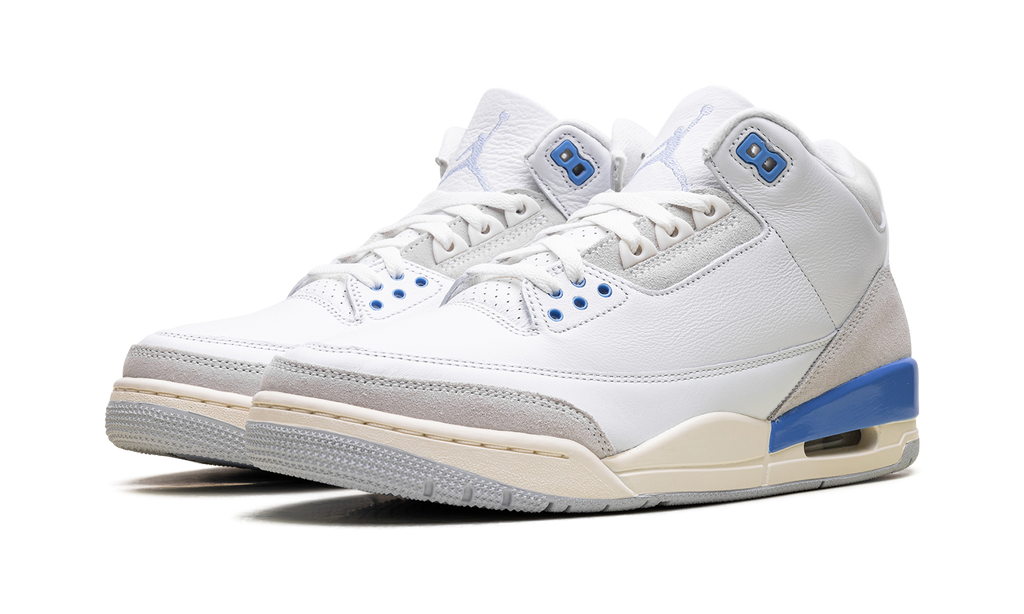 The Air Jordan 3 “Lucky Shorts” is a blue and white colorway of Michael Jordan’s third signature shoe. The “Lucky Shorts” AJ3 takes inspiration from a pair of UNC shorts that Jordan wore underneath his NBA uniform during his carer. The upper on this Jordan 3 mixes white leather with off-white suede and adds Carolina blue accents throughout.