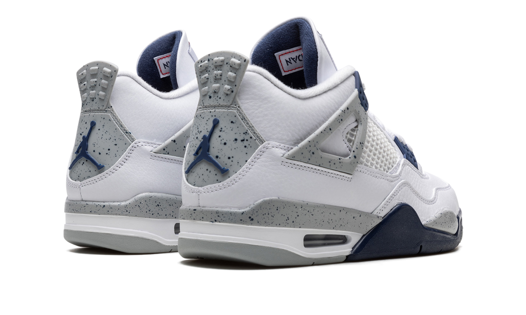 The Air Jordan 4 “Midnight Navy” is a colorway of Michael Jordan’s fourth signature shoe inspired by the model’s iconic “White Cement” style. The “Midnight Navy” replicates the color scheme of the Jordan 4 “White Cement,” but replaces the shoe’s red accents with navy. The upper is constructed from white leather, save for the tongue and mid-panel which feature tonal mesh detailing. Midnight Navy plastic lace holders are found on the throat and collar. The Jordan 4’s signature “Cement” detailing appears on the “Wings” tabs, on the mudguard, and on the Jumpman and “Air” branded heel counter. A visible Air unit in the heel completes the design. Release date: October 29, 2022