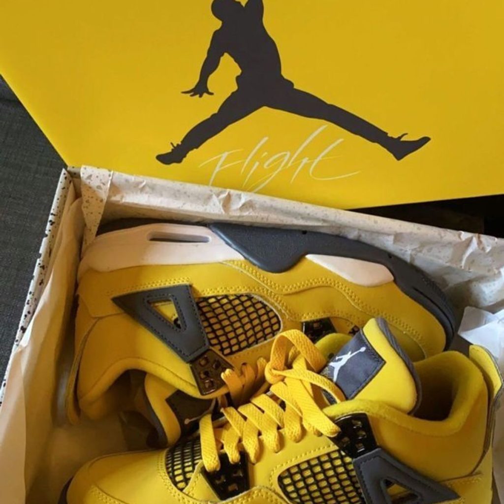 The Air Jordan 4 “Lightning 2021” is a modern re-issue of the desirable colorway of Michael Jordan’s fourth signature shoe that was originally released in August 2006. Without question one of the most sought-after non-original Air Jordan shoes ever, the first “Lightning” was released in hyper-limited quantities exclusively on Jumpman23.com (the former Jordan Brand website) alongside a “reverse” black and yellow “Thunder” Jordan 4, together creating the “Thunder & Lightning” pack. The “Lightning” was accompanied by an Air Jordan “Flight” T-shirt and the “Thunder” was paired with a varsity jacket. In 2012, Jordan Brand brought back the “Thunder,” but curiously decided against releasing the “Lightning.” 15 years after its debut, the “Lightning” returned in near true-to-original fashion. Like the OG, the modern incarnation of the “Lightning” features Tour Yellow nubuck on its upper with black mesh on the tongue and mid-panel. Grey “wings” and black eyelets contrast the yellow look. Elsewhere, white Jumpman branding appears on the nylon tongue tag and a black Jumpman graces the back of the shoe. Jordan Brand opts for a slightly lighter grey rubber outsole than that of the unit found on the original “Lightning” from 2006. Release date: August 28, 2021
