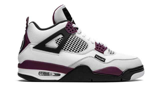The Air Jordan 4 PSG “Paris Saint Germain” is a desirable collaboration between the European football club and Jordan Brand on Michael Jordan’s fourth signature shoe. Paris Saint Germain, or simply “PSG,” has received special colorways of classic Air Jordans since inking a sponsorship deal with Jordan Brand in 2018. The upper features smooth white leather on the mudguard, which spans from the heel to the toe. Tumbled white leather can be found around the eyelets, collar, and heel. Subtle light grey nubuck detailing is located on the toe. White netting is layered over a black synthetic material on the tongue and mid-panel. Bordeaux accenting comes into play on the plastic lace holders and midsole walls. The burgundy hue can also be found on the underside of the tongue and on the heel. Dual “Paris Saint Germain” and Jumpman detailing dots the heel, while an added “Paname” (another word for Paris) tab is found near the toe. Release date: October 10, 2020.
