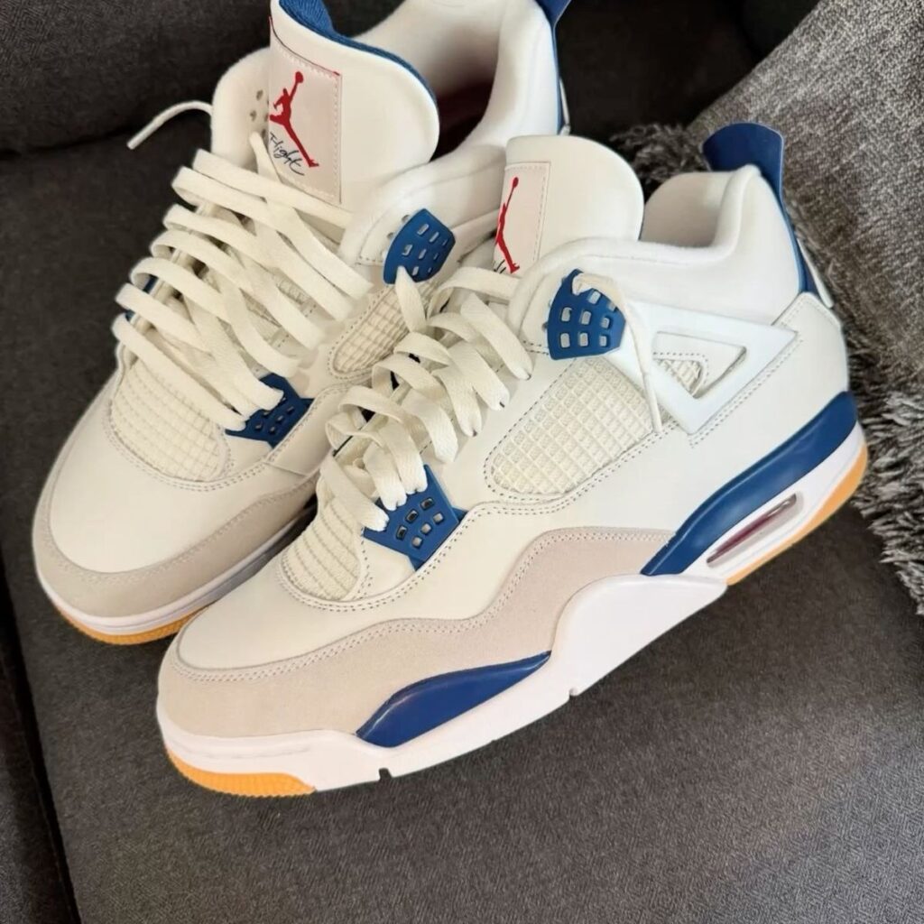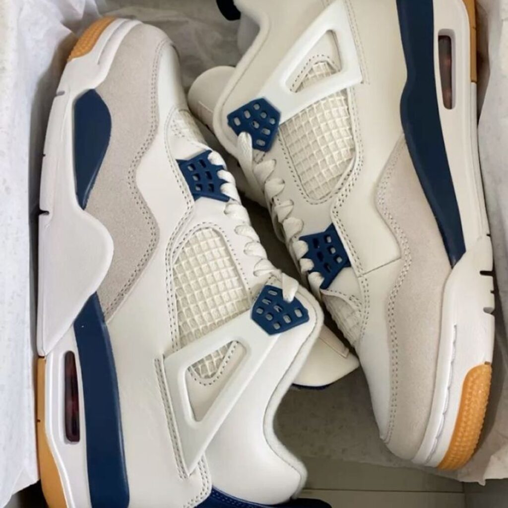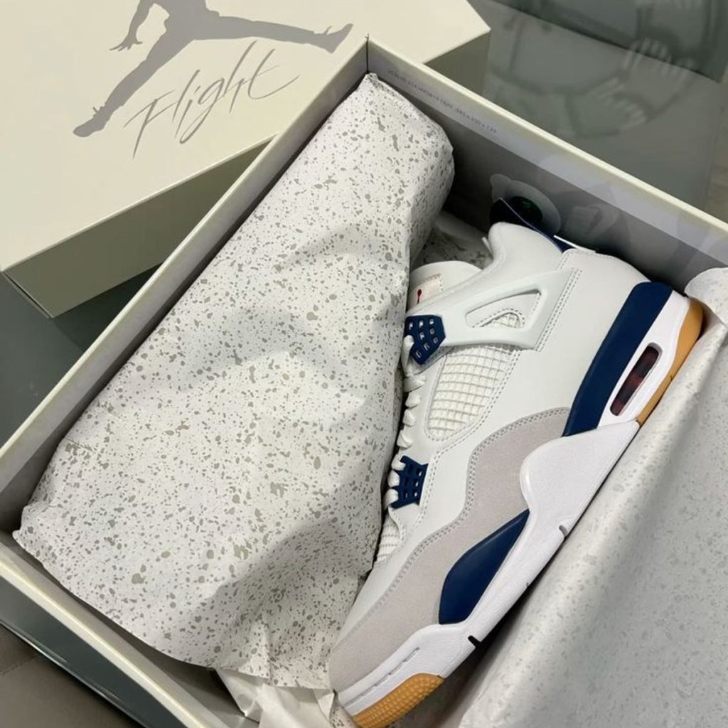 The Nike SB x Air Jordan 4 “Navy” is a new installment in the ongoing collaboration between Nike Skateboarding and Jordan Brand. The Nike SB AJ4 looks like a traditional Jordan 4 but has some unique details. Suede is placed around the toe box to make the shoe more skate-friendly. The clean navy and white upper is accented with a gum outsole, and Nike SB branding appears on the heel.