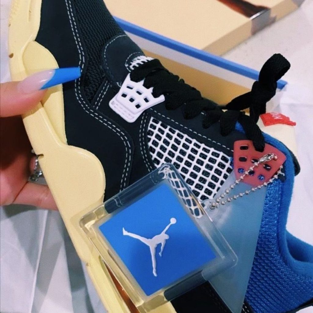 The Union x Air Jordan 4 “Off Noir” is one of two desirable colorways produced exclusively for the Los Angeles boutique and Jordan Brand’s Summer 2020 collaboration. The “Off Black” or “Off Noir” design of Union’s Air Jordan 4 collection features a radically new and exciting color scheme that incorporates elements of vintage sportswear. A premium washed black plush suede appears on the mudguard, toe cap, and eyelets. Black and blue mesh detailing can be found on the toe and collar, respectively. Pink and grey plastic eyelet accents and a translucent lace support wing add to the unique appearance of the shoe. Additional style cues include white netting on the tongue and mid-panel, pink “Nike Air” on the black plastic heel cup, and a vintage inspired yellow sole. A shortened tongue measured to the specifications of Chris Gibbs, Union’s owner, is folded over and stitched down. The wearer has the ability to remove the stitching to obtain a traditional Air Jordan 4 look. Release date: August 29. 2020.