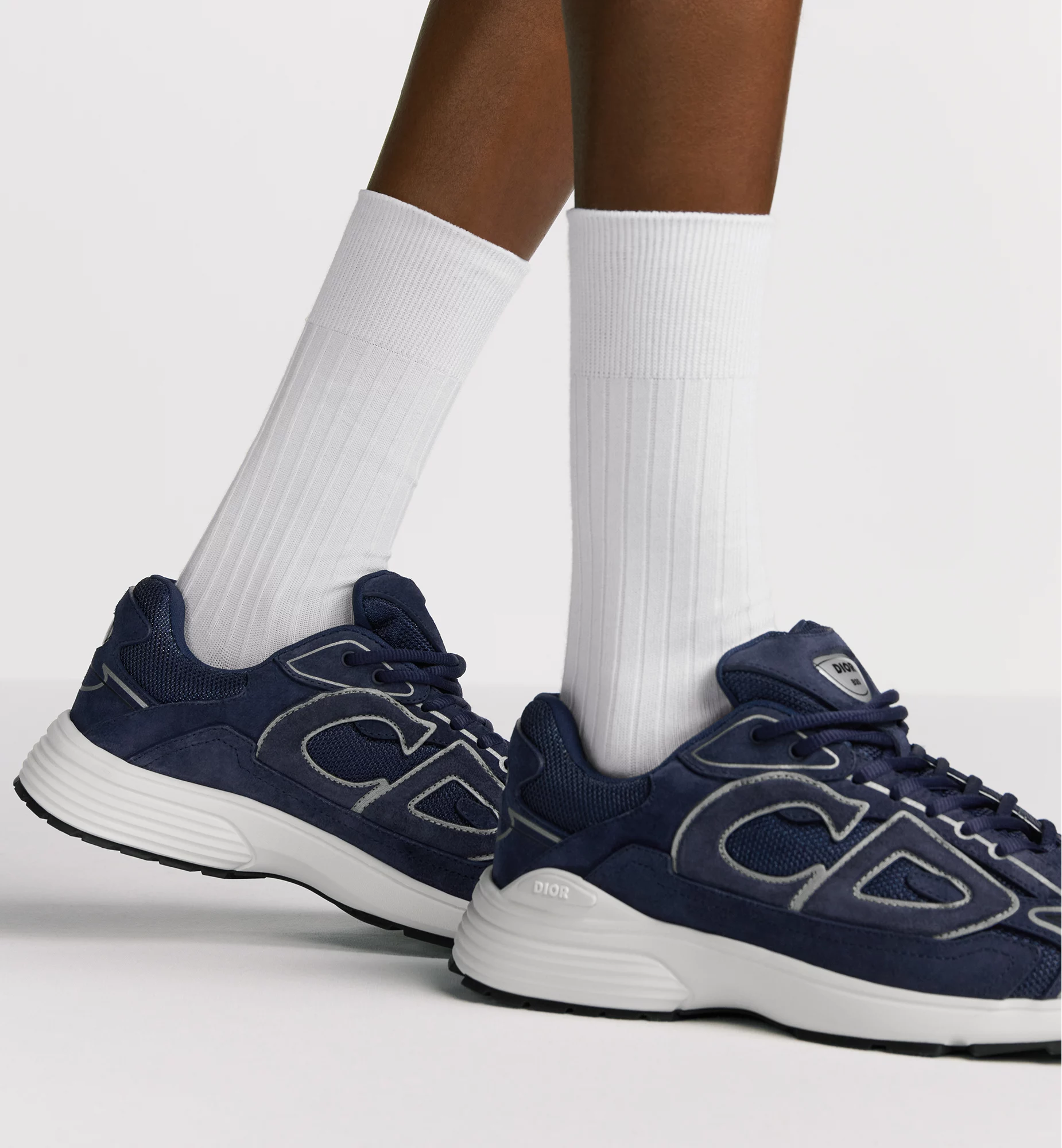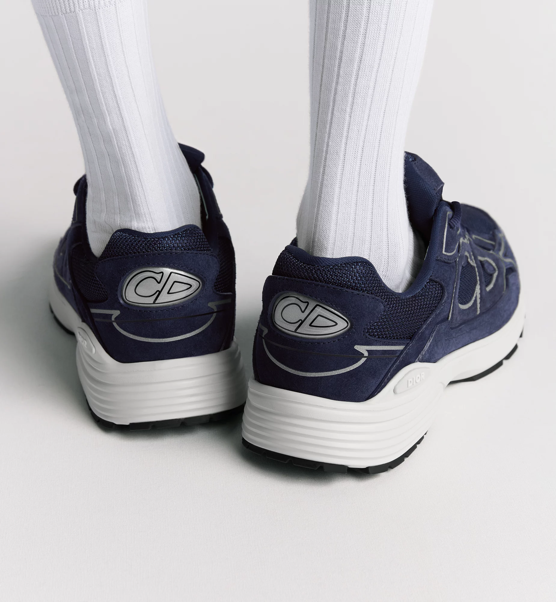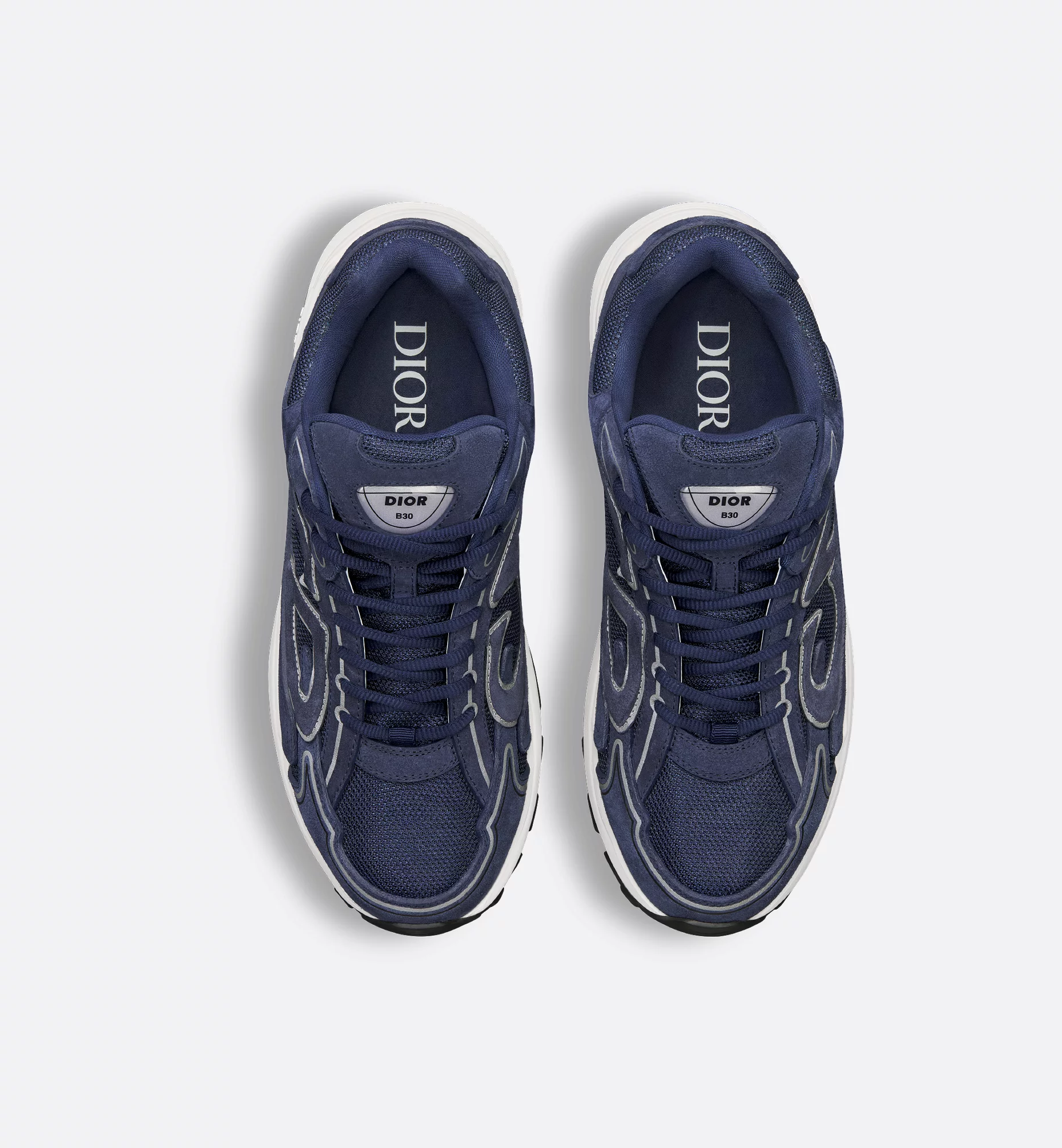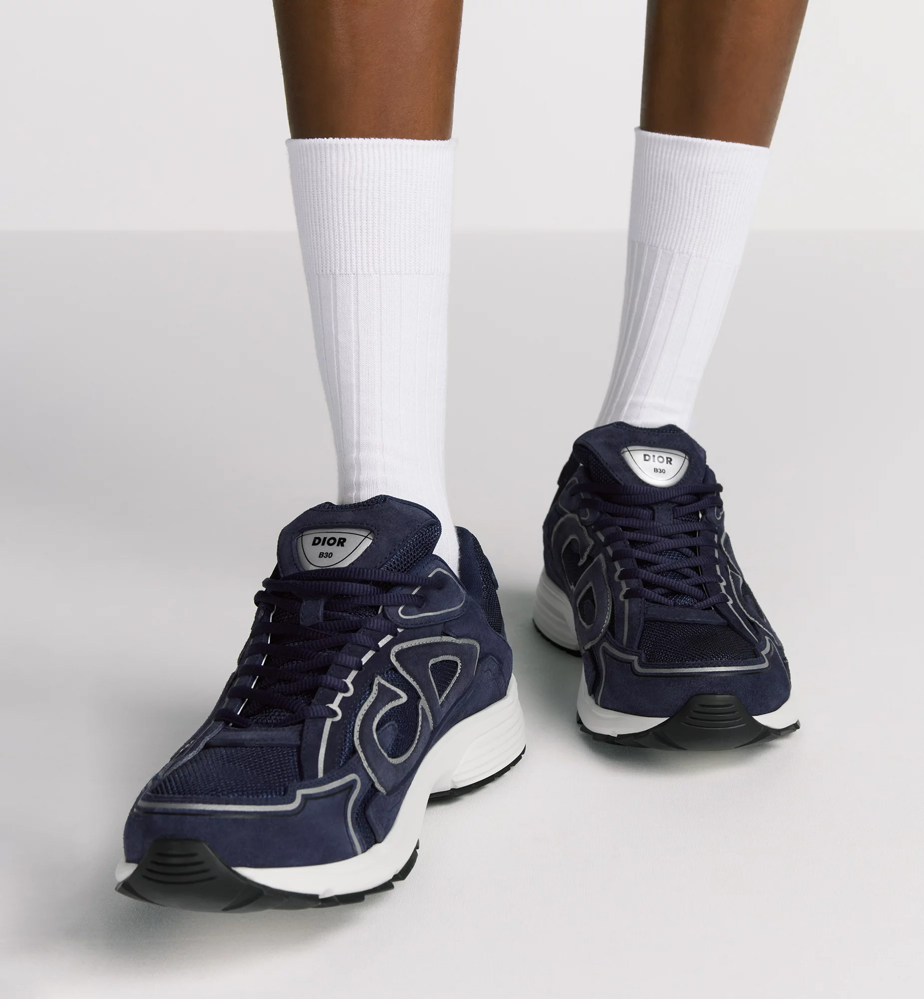 The B30Â Countdown sneaker is a new House essential distinguished by its modern and sporty silhouette. Revamped in modern navy blue suede, it is enhanced by a CD30 signature with a graphic aesthetic. The B30Â Countdown also features silver-tone Dior B30 and CD30 signatures on the tongue and back. A sculpted and ultralightweight rubber outsole spotlights various hallmark details while elastic on the interior provides optimal comfort. The B30Â Countdown sneaker will complete any casual outfit.
