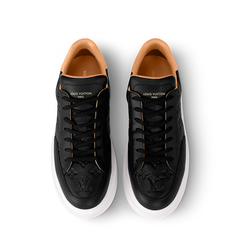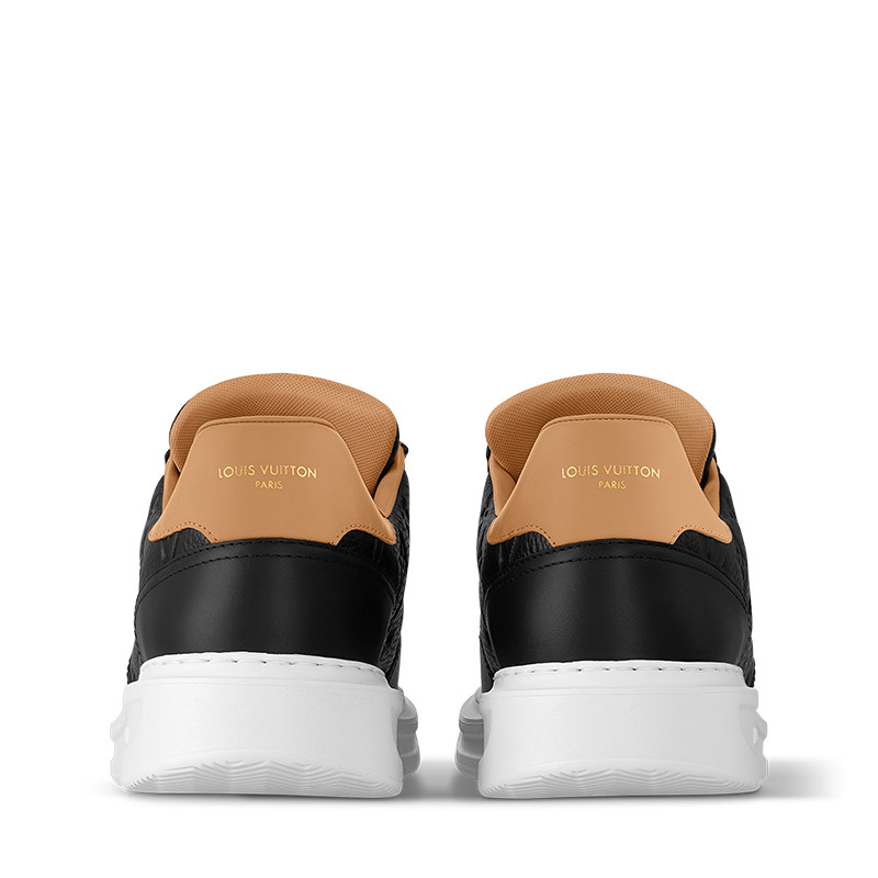 The Beverly Hills sneaker is crafted from supple, grained calf leather, which is embossed with the iconic Monogram pattern. The natural calf-leather trim at the back recalls that used on Louis Vuitton leather goods. This model is distinguished by its ultra-light, white rubber outsole, debossed with the House signature.