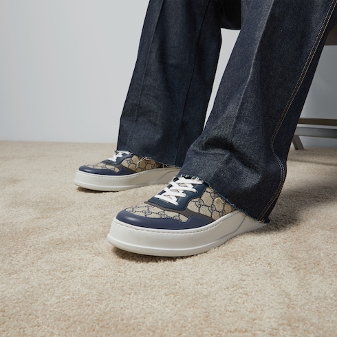 Mirroring the material’s historic origins, GG Supreme is introduced in a timeless mix of blue and beige for Gucci Love Parade. The canvas has come to the front of each collection decade after decade to become a hallmark of the House. Here, the classic palette defines this pair of sneakers