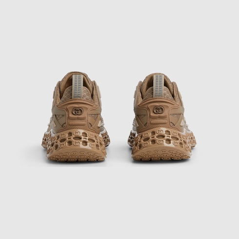 In the Spring Summer 2025 collection, this Gucci cub3d sneaker blends innovative materials and construction. The upper is a mix of Demetra and mesh, featuring details created with a high frequency technique, while the sole combines an EVA-filled interior and TPU on the outside, complete with a 3D Interlocking G pattern.