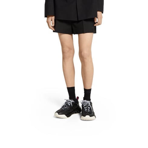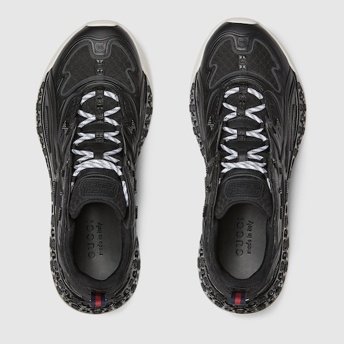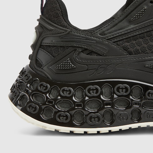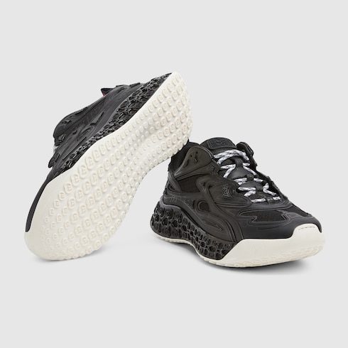 In the Spring Summer 2025 collection, this Gucci cub3d sneaker blends innovative materials and construction. The upper is a mix of Demetra and mesh, featuring details created with a high frequency technique, while the sole combines an EVA-filled interior and TPU on the outside, complete with a 3D Interlocking G pattern.