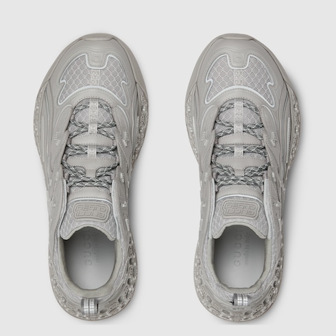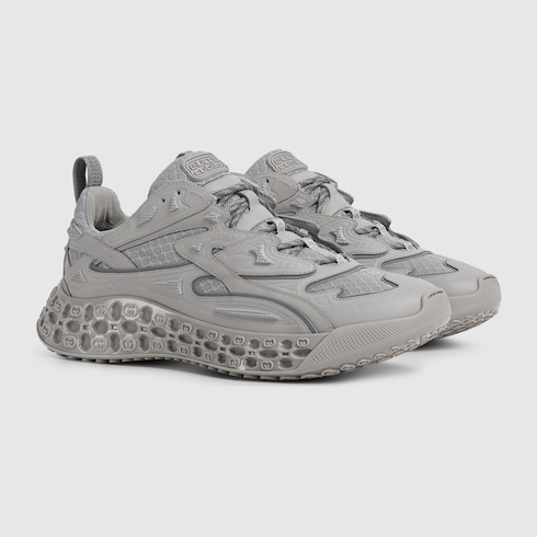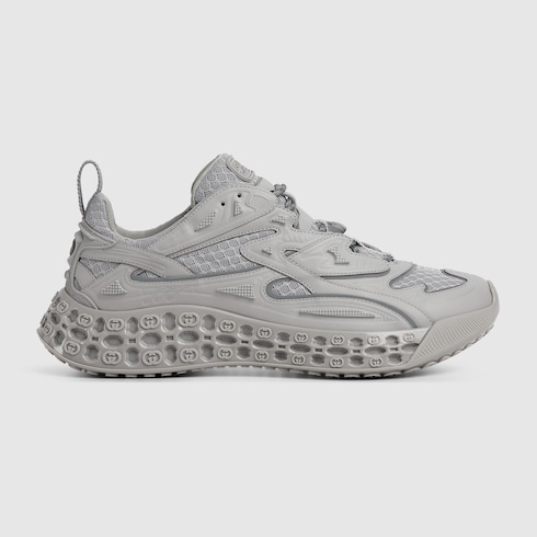 In the Spring Summer 2025 collection, this Gucci cub3d sneaker blends innovative materials and construction. The upper is a mix of Demetra and mesh, featuring details created with a high frequency technique, while the sole combines an EVA-filled interior and TPU on the outside, complete with a 3D Interlocking G pattern.