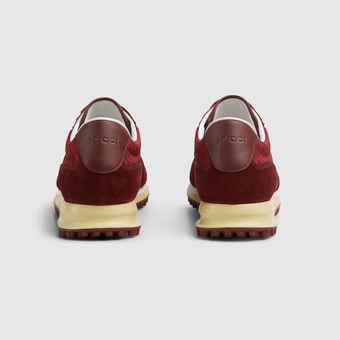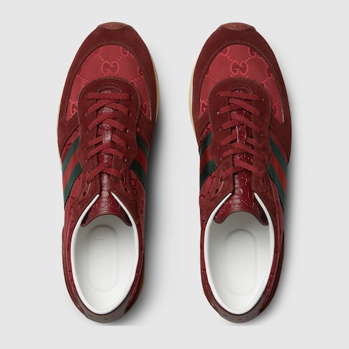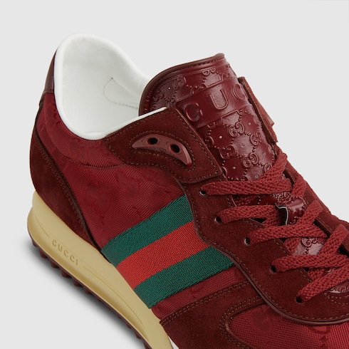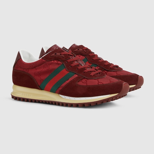 Influenced by classic sneakers from the ’70s, the Screener sneakers—named for the defensive sports move—feature the Web stripe on the side and the vintage Gucci logo. Here the emblematic style is presented in Gucci Rosso Ancora red canvas and defined by a tonal leather trim.
