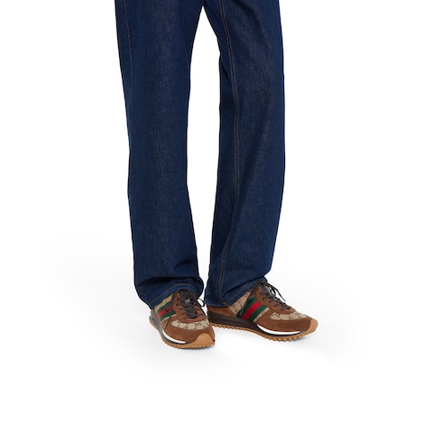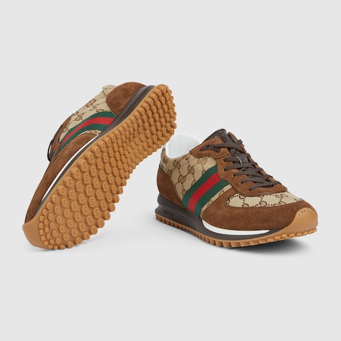 In the Fall Winter 2025 collection, the Gucci Re-Motion sneaker blends classic with contemporary elements. Crafted from GG canvas, the model is completed with the signature green and red Web. The lightweight, flexible outsole has gone through a special treatment to create a retro appeal.