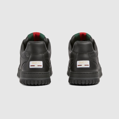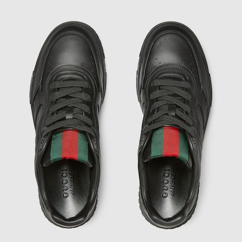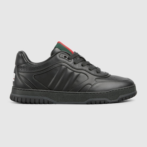 The Re-Web sees Gucci’s heritage stripes as a bold statement detail on a contemporary silhouette. This pair is crafted from black leather. Defined by multiple signature details, this new sneaker takes center stage with the bold green and red Web tongue.
