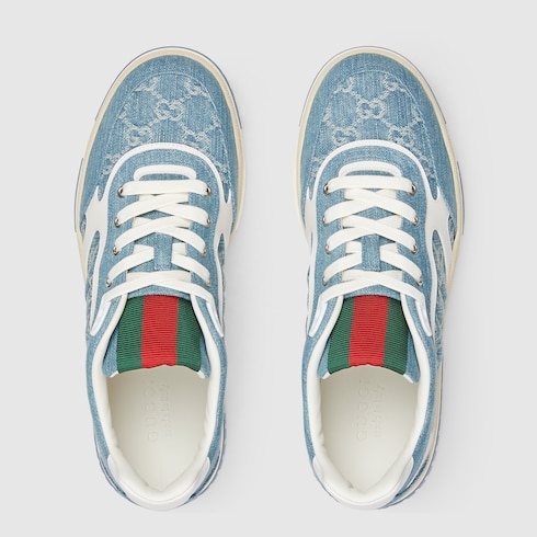 The Re-Web sees Gucci’s heritage stripes as a bold statement detail on a contemporary silhouette. This pair is crafted from GG denim with a leather trim. Defined by multiple iconic details, this new sneaker takes center stage with the bold green and red Web tongue.
