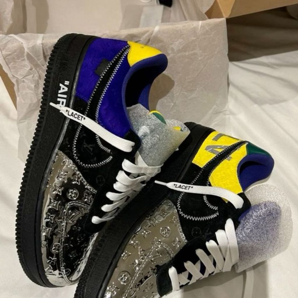 Discover the pinnacle of luxury sneaker collaborations with the Louis Vuitton Nike Air Force 1 Low By Virgil Abloh in Black Metallic Silver. Released on July 19, 2022, this sneaker is a testament to Virgil Abloh’s visionary approach, merging the iconic design of the Air Force 1 with Louis Vuitton’s unmatched craftsmanship. The black, metallic silver, yellow, and royal palette offers a bold and sophisticated aesthetic, highlighting Abloh’s knack for transforming classic silhouettes into modern masterpieces.