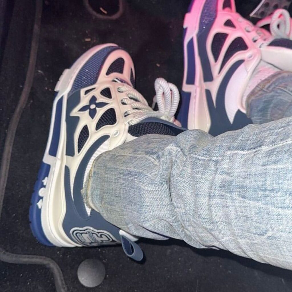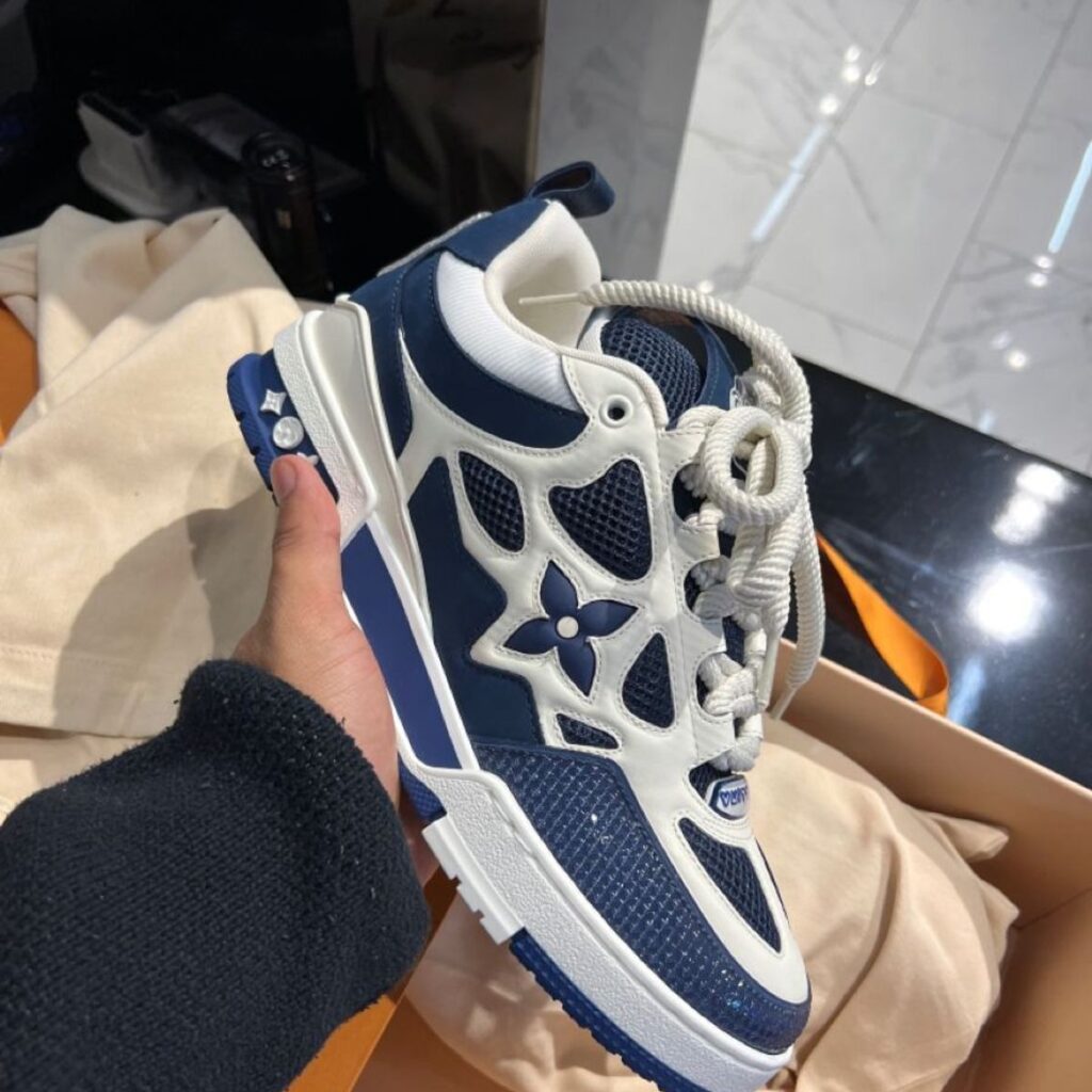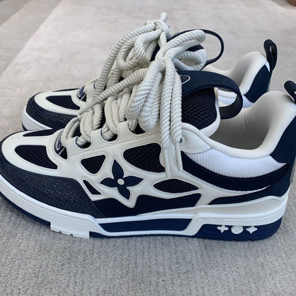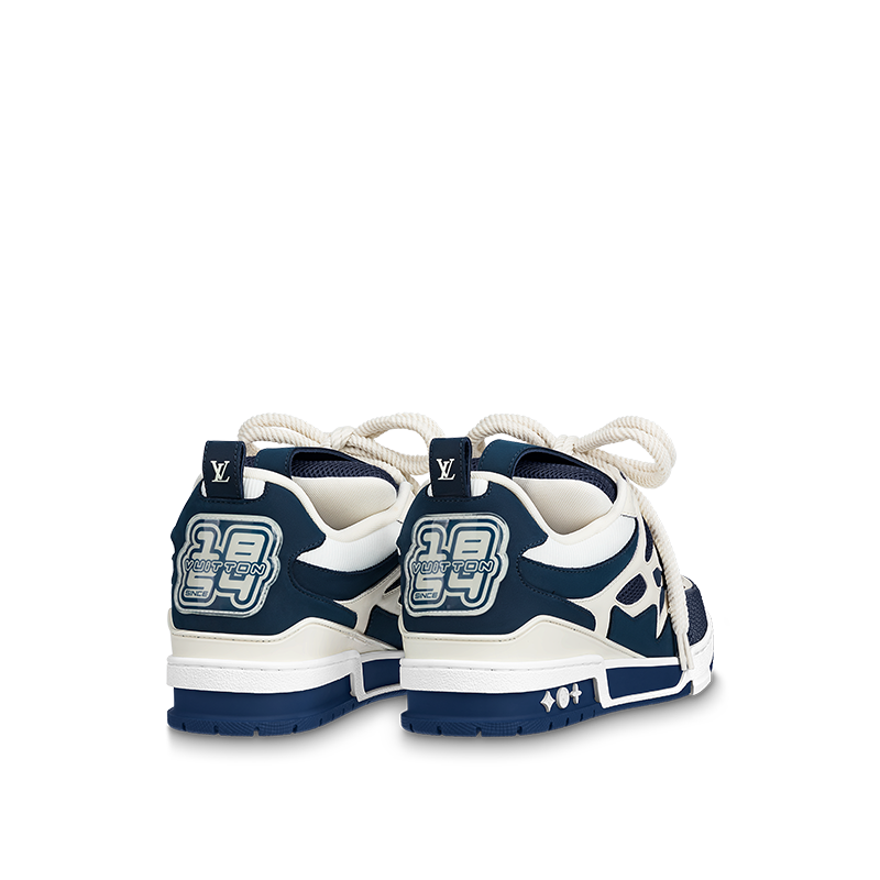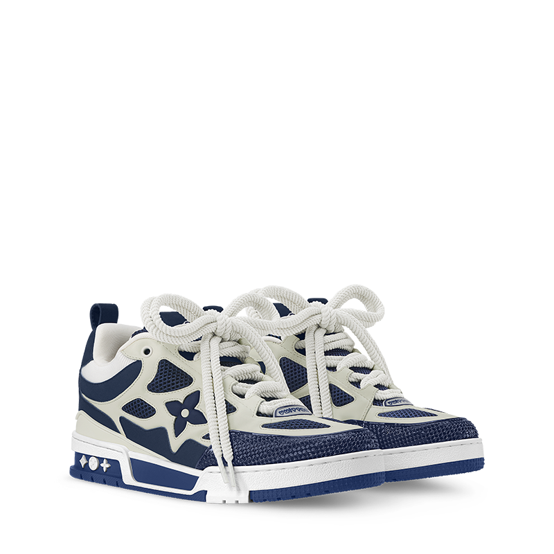 The LV Skate sneaker references a Nineties-inspired design first seen at Louis Vuitton’s Fall-Winter 2022 men’s show. Its elaborate, bicolor upper with Monogram Flower detailing combines technical mesh, calf leather and suede. This model is notable for its padded collar, technical double laces and bicolor rubber outsole decorated with Monogram Flowers.