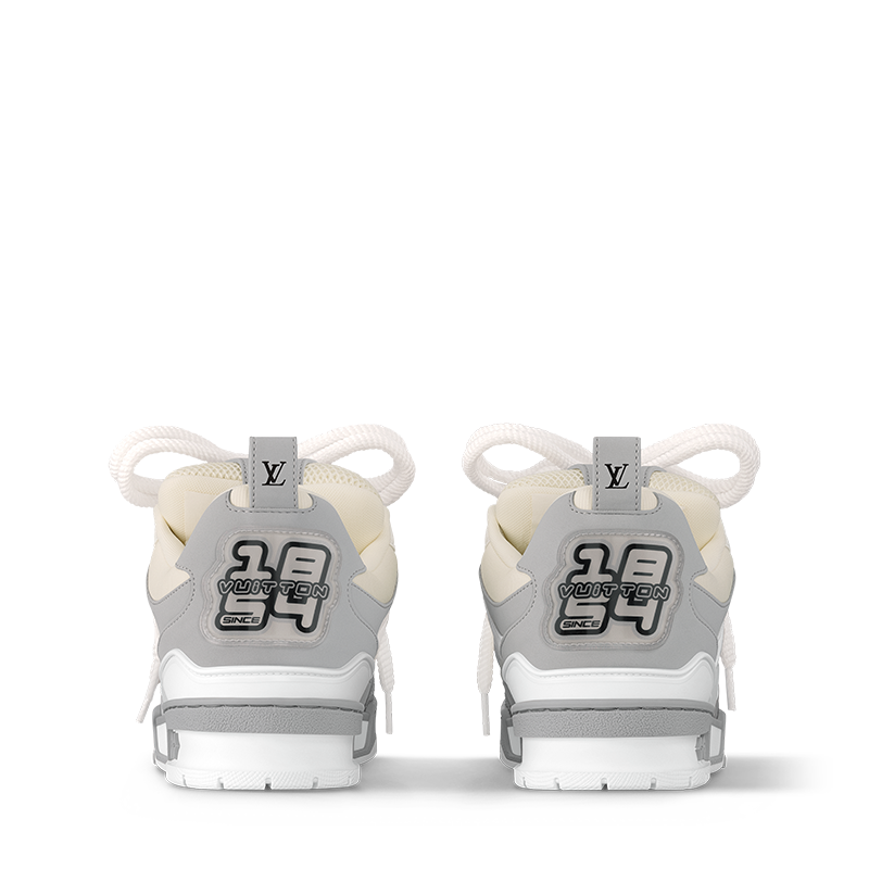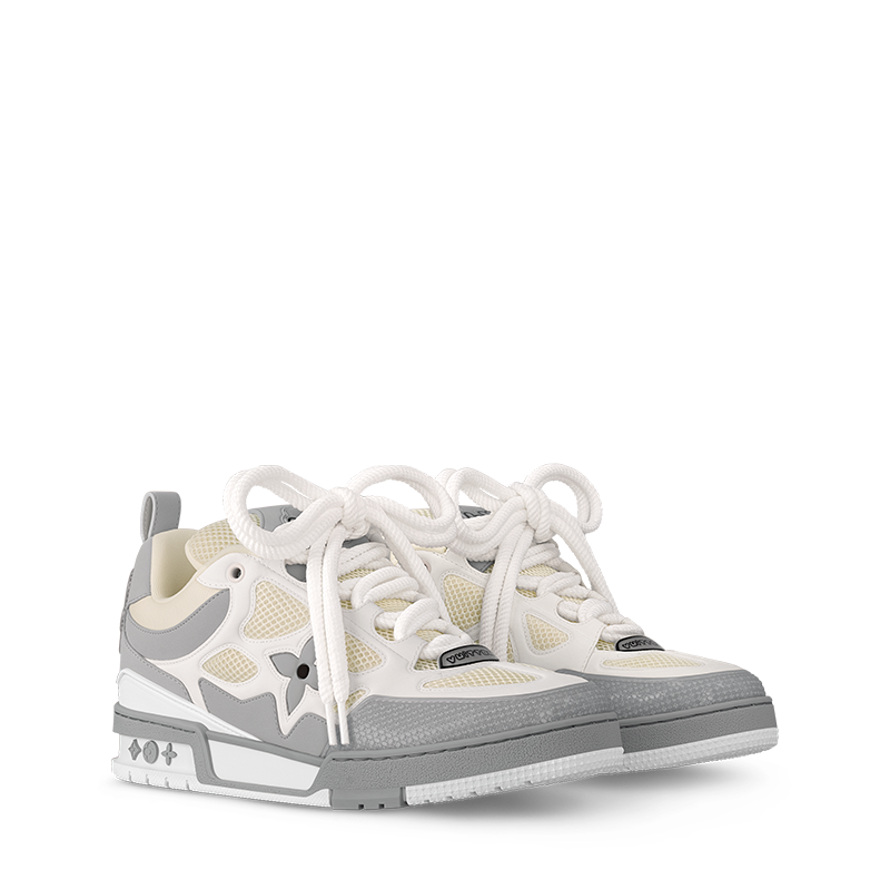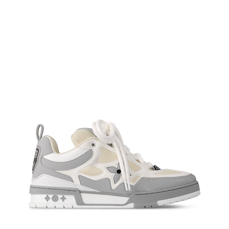 This colorblock version of the LV Skate sneaker comes in a mix of nubuck calf leather and technical mesh. Inspired by Nineties’ skate shoes, this model is notable for its thick double laces and exaggerated, padded collar and tongue. It has an oversized Monogram Flower on the side and an LV Vuitton logo on the tongue.