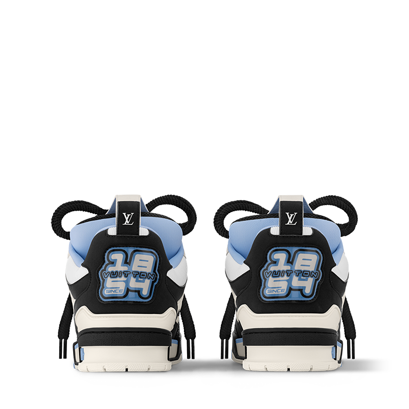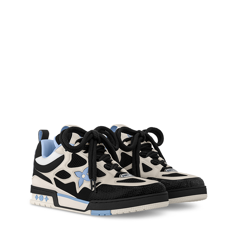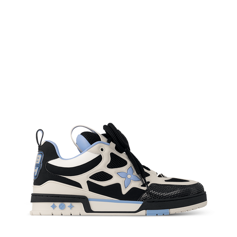 The LV Skate sneaker comes in a mix of materials and a black and white palette illuminated by pops of color. Inspired by Nineties’ skate shoes, this model features thick cotton laces and an exaggerated, padded collar and tongue. Key details include a Monogram Flower on the side and an LV Vuitton signature on the tongue.
