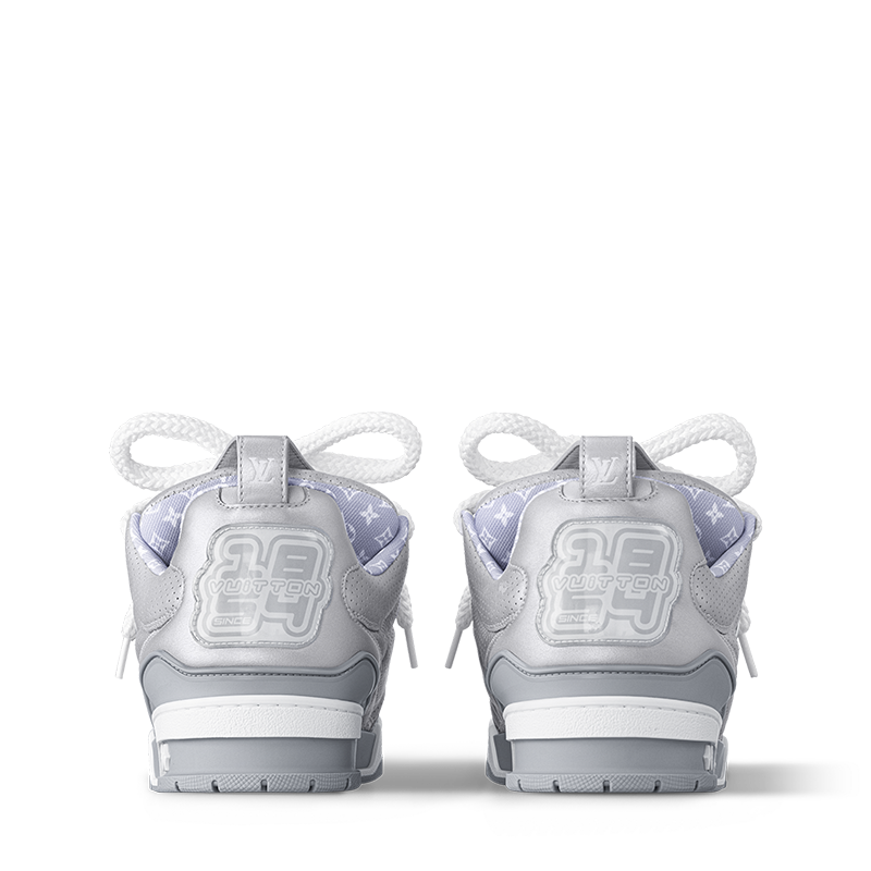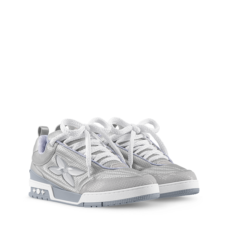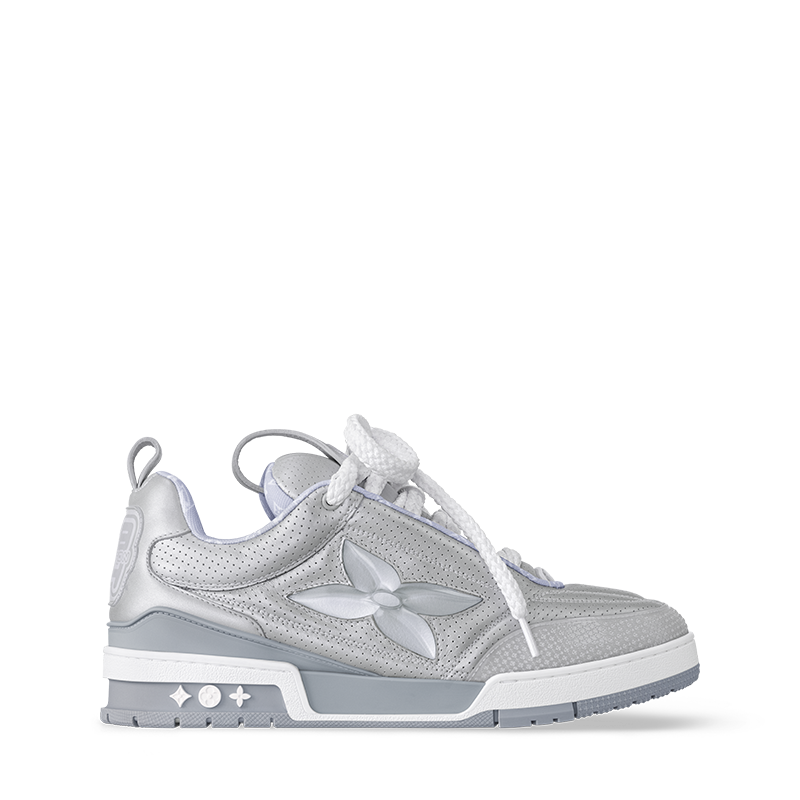 The LV Skate sneaker is reimagined this season in metallic and perforated calf leather. Inspired by Nineties’ skate shoes, this model is notable for its thick double laces and exaggerated, padded tongue and collar. Its many signature details include a large Monogram Flower on the side and Vuitton since 1854 at the back.