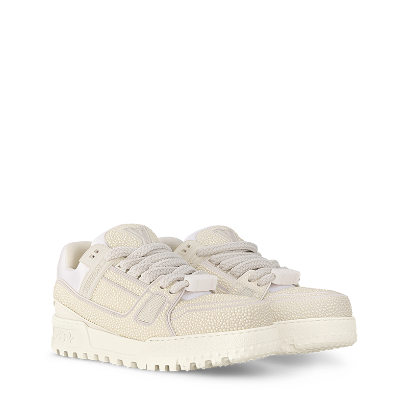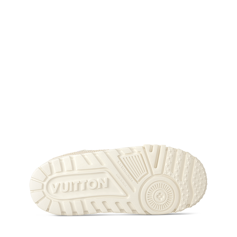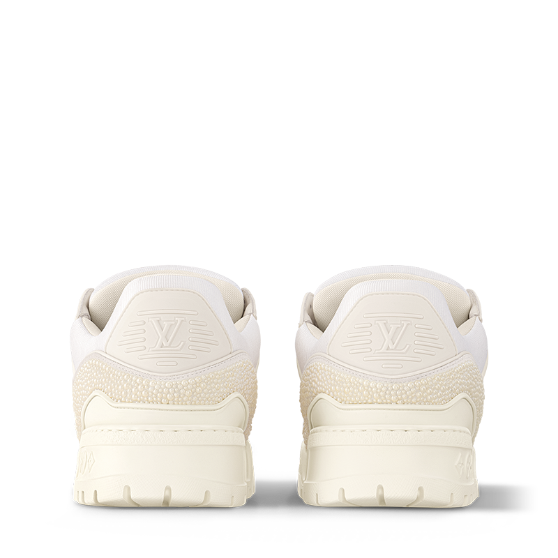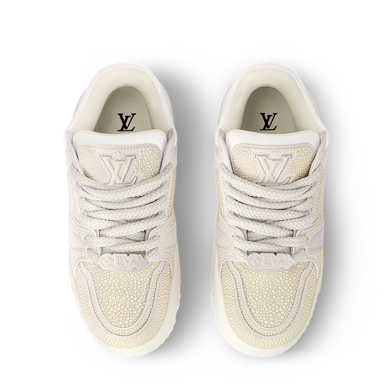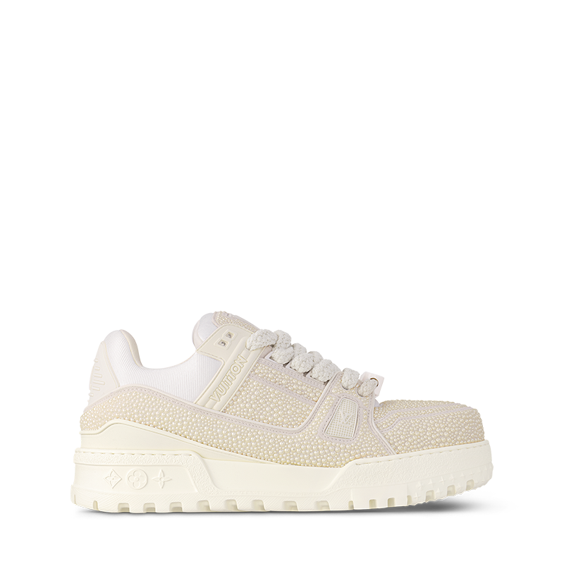This edition of the LV Trainer Maxi sneaker is embellished with pearl-like Swarovskiâ„¢ crystals for an eye-catching, shimmering effect. An oversized version of the iconic LV Trainer sneaker, this model features an exaggerated, padded collar and chunky EVA outsole. Tone-on-tone textile laces and rubber signatures, including Vuitton and the LV Initials, complete this design.