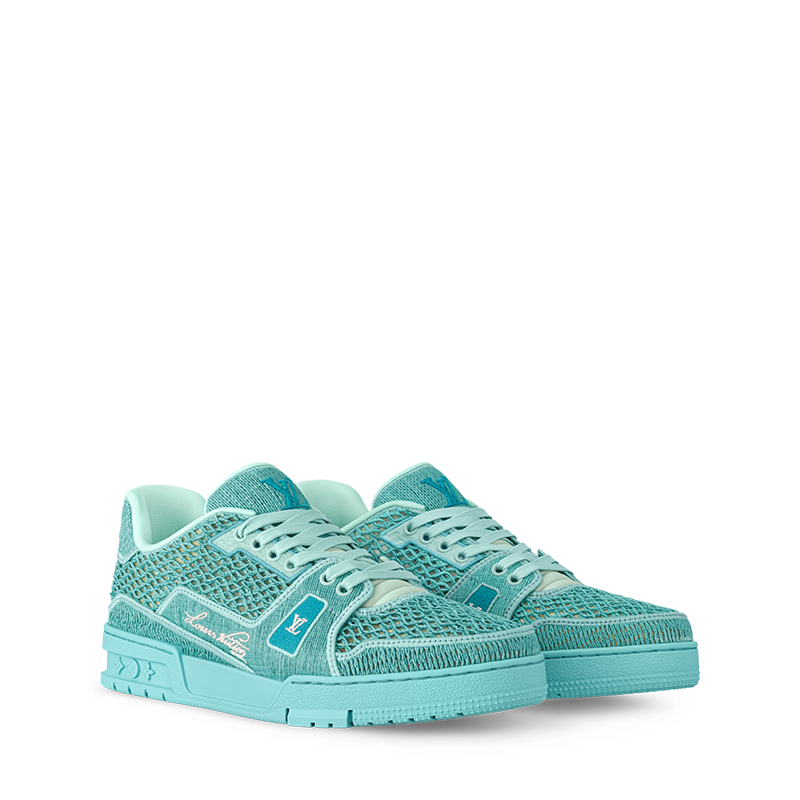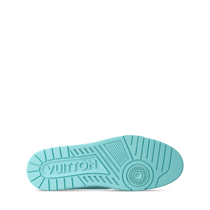 The LV Trainer sneaker is revisited in raffia, coordinating with the color palette of the Prefall 2025 collection. The elaborately constructed upper, which references vintage basketball sneakers, is embroidered with the LV Initials and Louis Vuitton script signatures. The tonal rubber outsole is decorated with three Monogram Flowers.