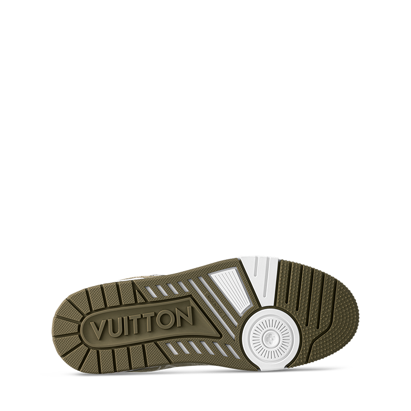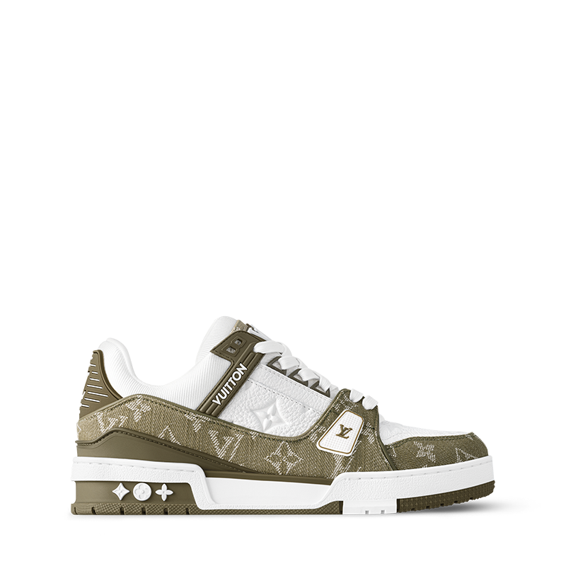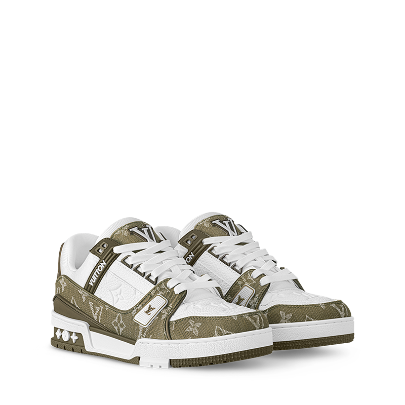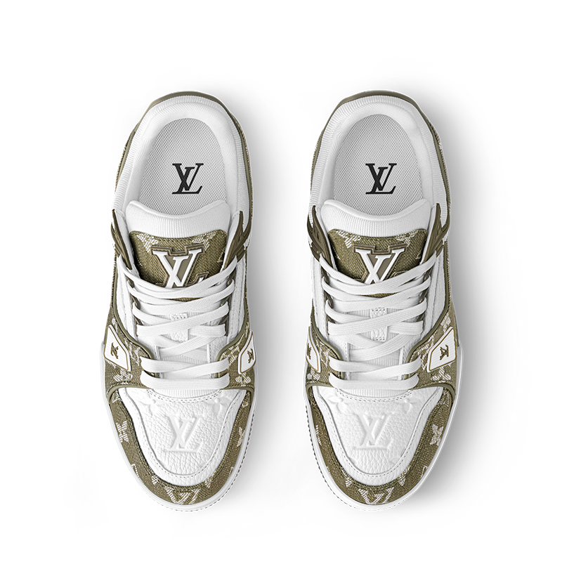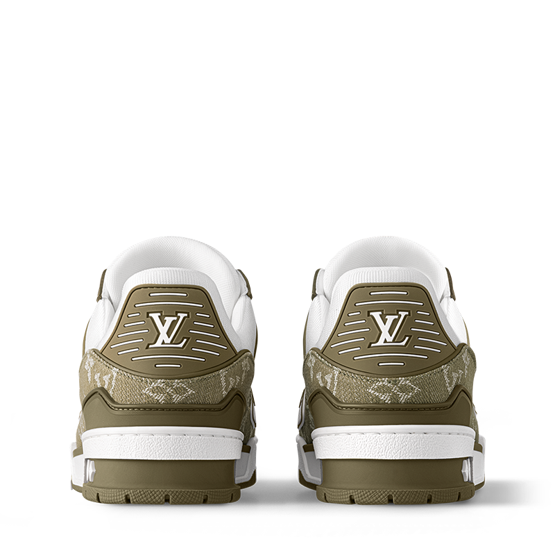 This edition of the LV Trainer sneaker combines Monogram denim with Monogram grained calf leather. The juxtaposition of two colors and two materials highlights the elaborately constructed upper of this cult sneaker, which was originally designed by Virgil Abloh. It is complemented by rubber LV Initials and Vuitton signatures and a two-tone rubber outsole.