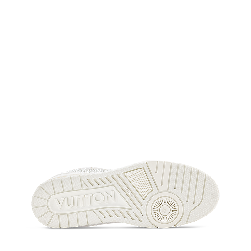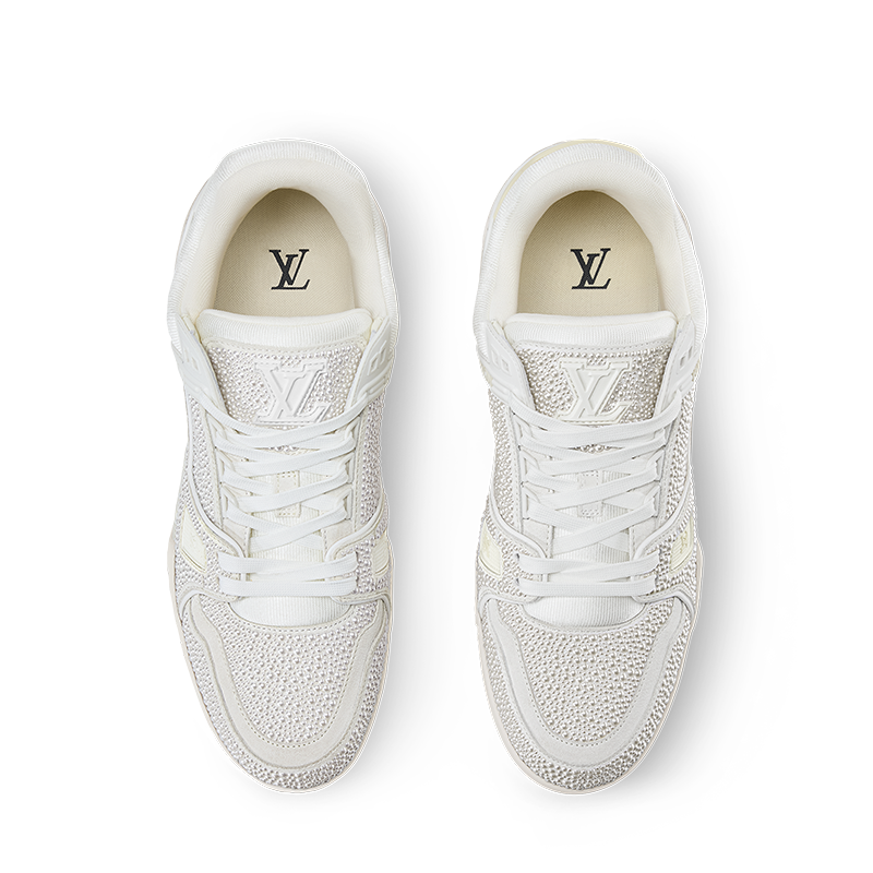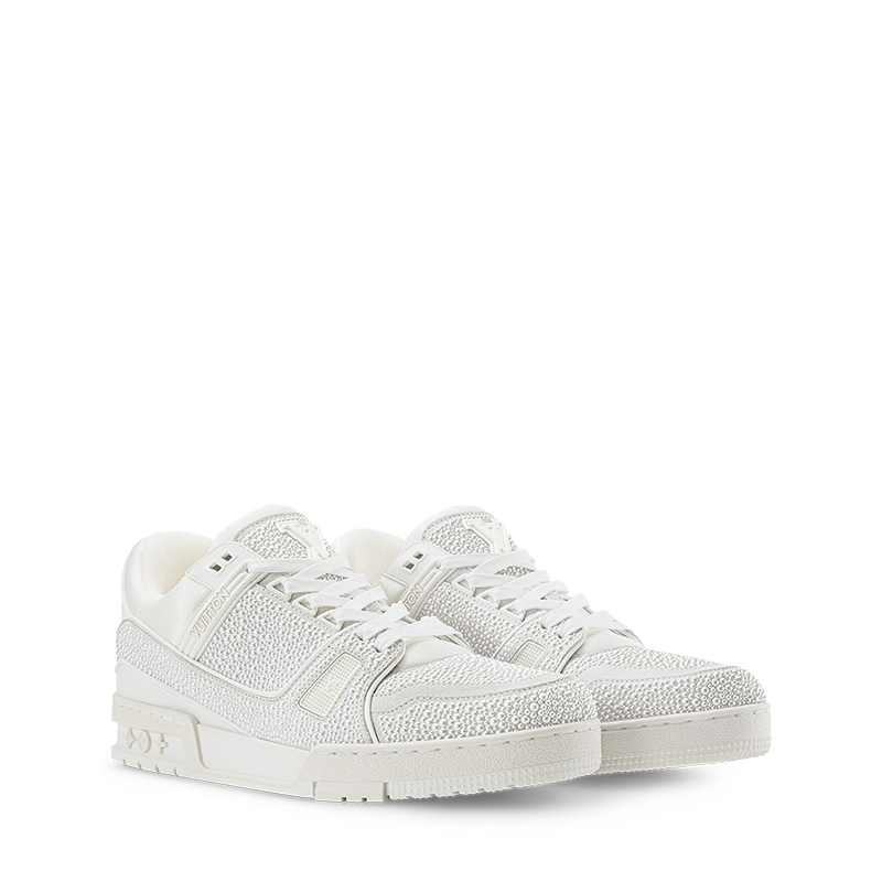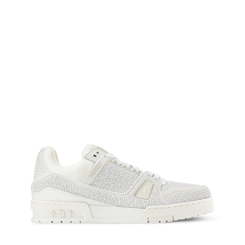 This exclusive edition of the LV Trainer sneaker is entirely encrusted with Swarovski™ pearls, creating a pure, glistening effect. Originally designed by Virgil Abloh, this cult model was inspired by vintage basketball sneakers. Its elaborately constructed upper is complemented by rubber signatures, including the LV Initials on the tongue and back, and Vuitton on the side.