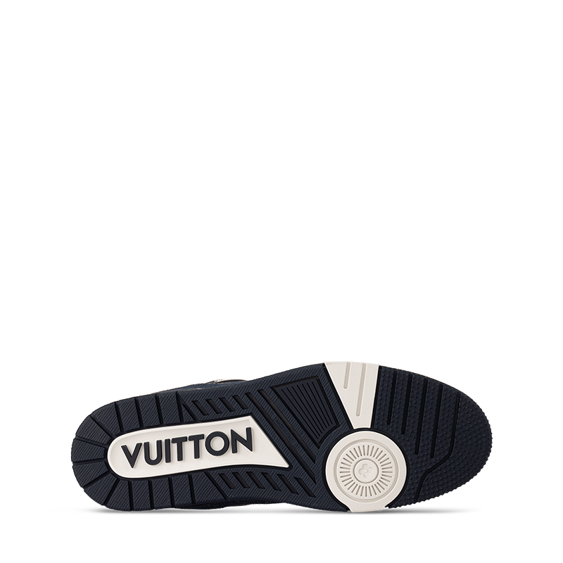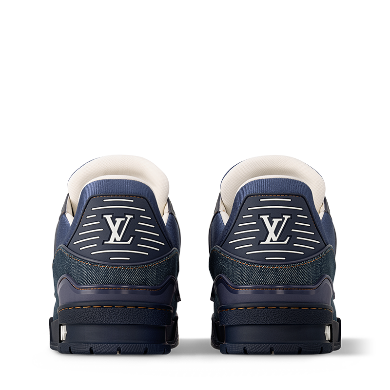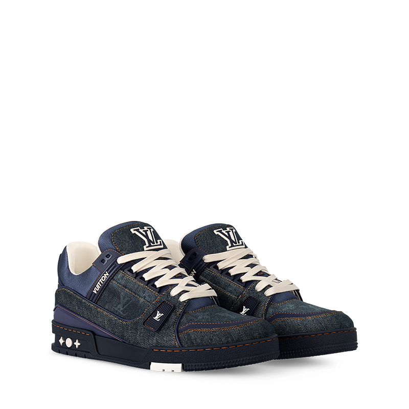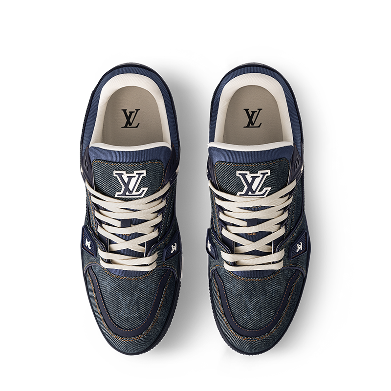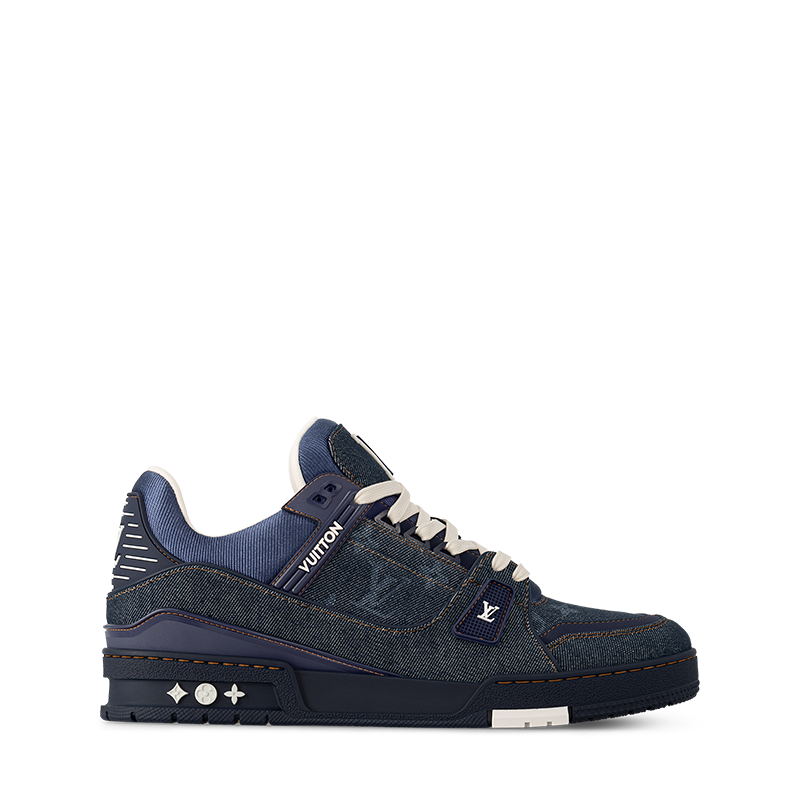 The LV Trainer sneaker is revisited in Monogram denim for a relaxed signature look. This cult design, which was inspired by vintage basketball sneakers, is notable for its elaborately constructed upper with rubber LV Initials and Vuitton signatures. It is finished with thick white laces and a two-tone rubber outsole decorated with Monogram Flowers.