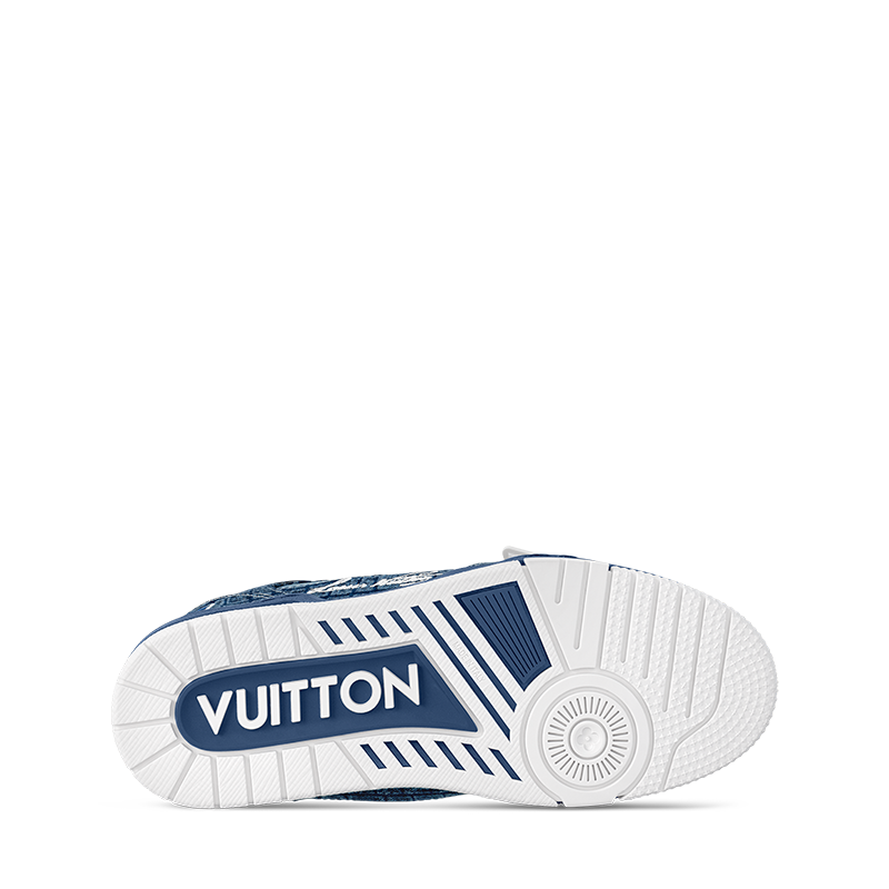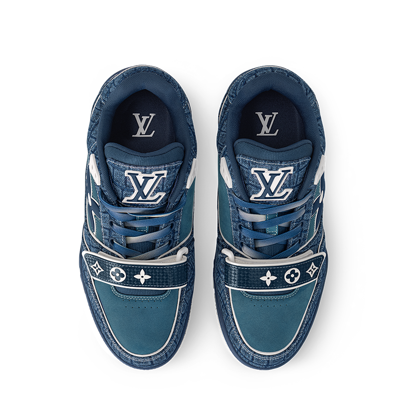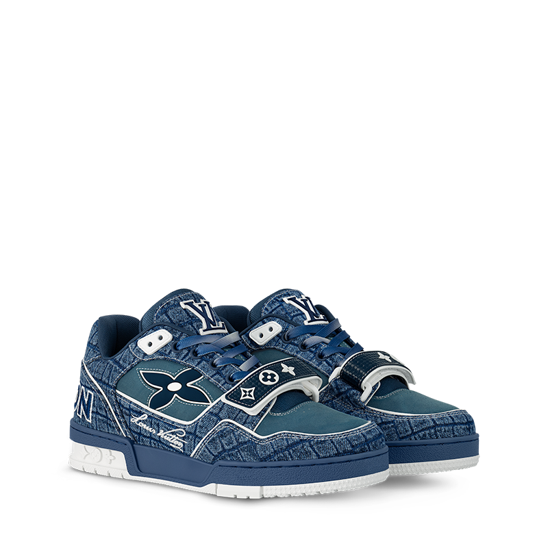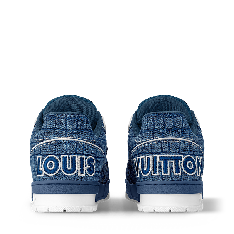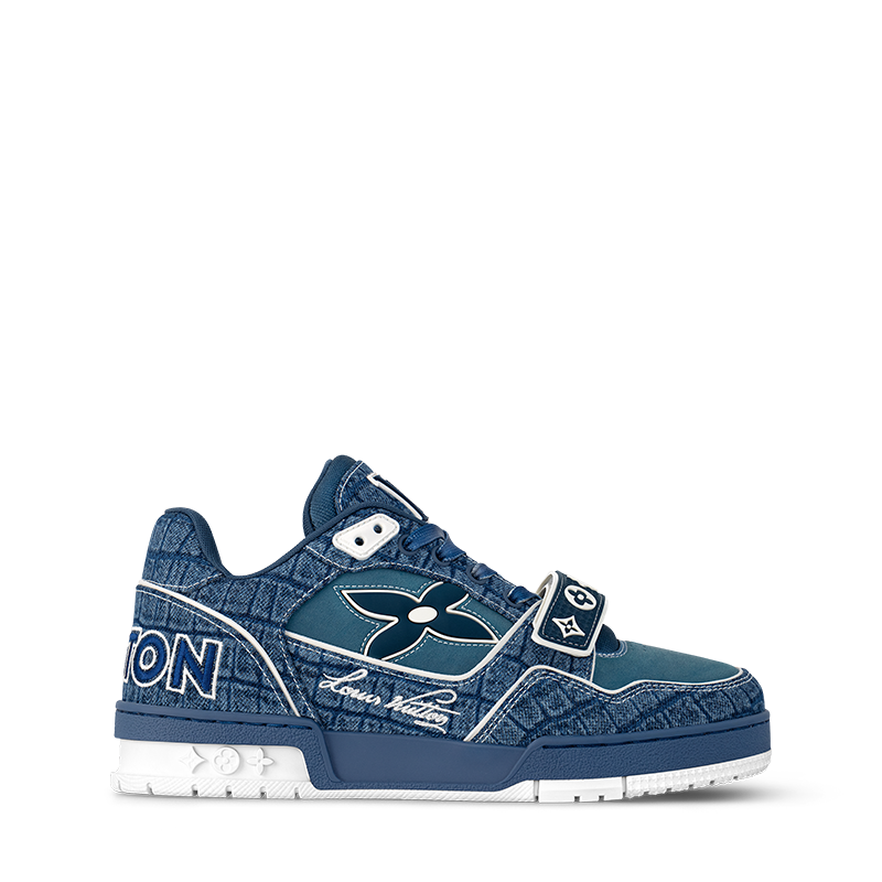 The iconic LV Trainer sneaker is revisited in denim embossed with a crocodile motif. Inspired by vintage basketball sneakers, this model displays an array of House emblems, including the Louis Vuitton script signature, while Monogram Flowers appear on both the upper and outsole. It is fastened with gradient laces and an adjustable velcro strap.