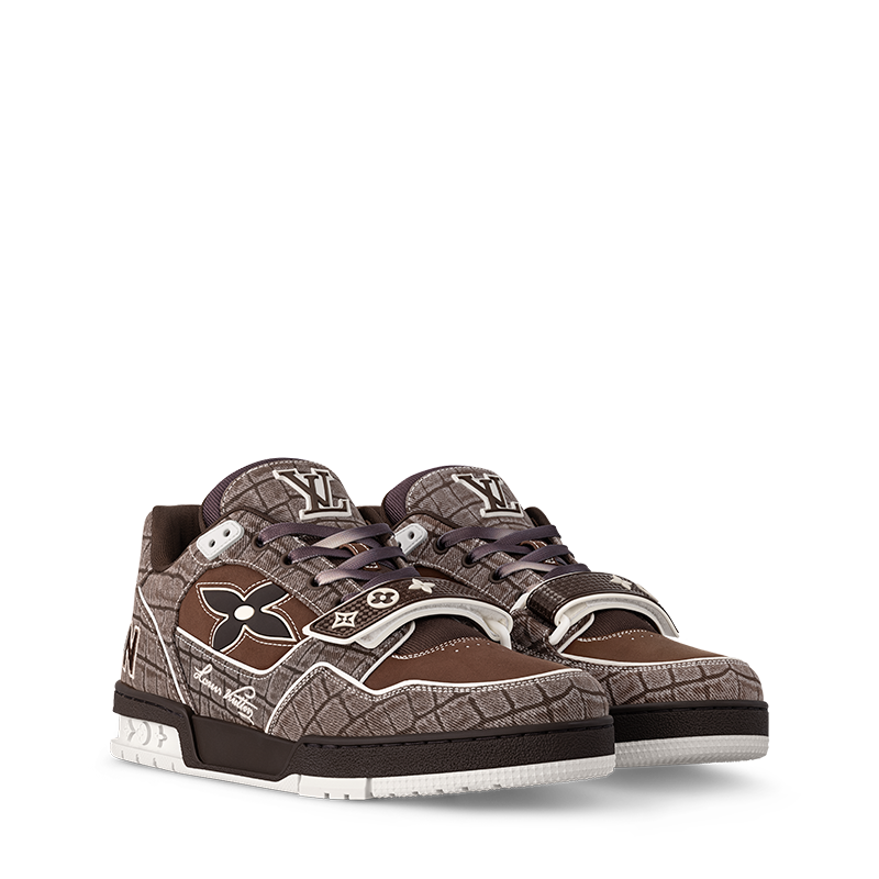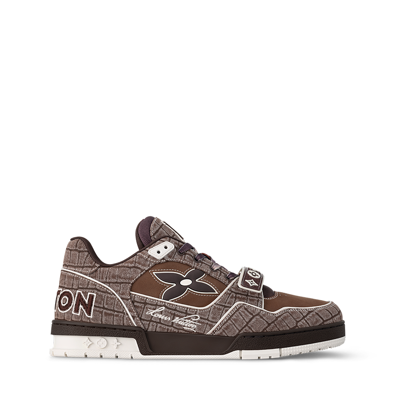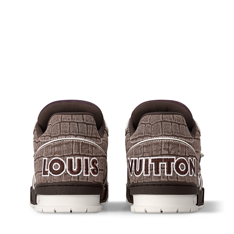 The iconic LV Trainer sneaker is revisited in denim embossed with a crocodile motif. Inspired by vintage basketball sneakers, this model displays an array of House emblems, including the Louis Vuitton script signature, while Monogram Flowers appear on both the upper and outsole. It is fastened with gradient laces and an adjustable velcro strap.