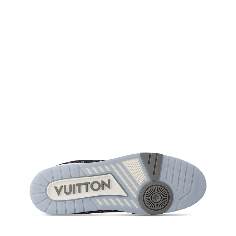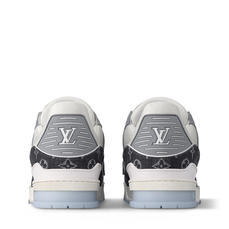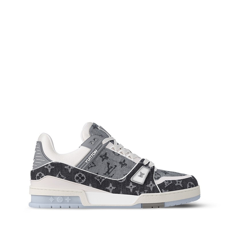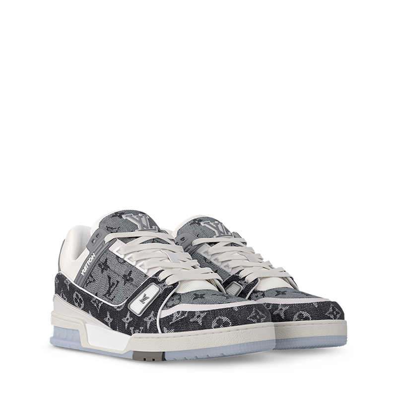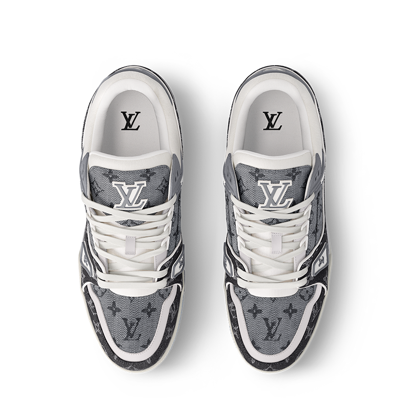 This edition of the LV Trainer sneaker combines two shades of Monogram denim for a smart, tonal look. The design is complemented by two-tone laces and rubber signatures, including the LV Initials. Originally designed by Virgil Abloh and inspired by vintage basketball sneakers, this model comes on a technical rubber outsole decorated with Monogram Flowers.
