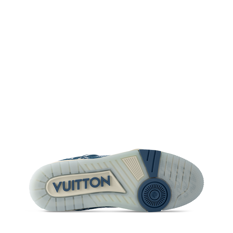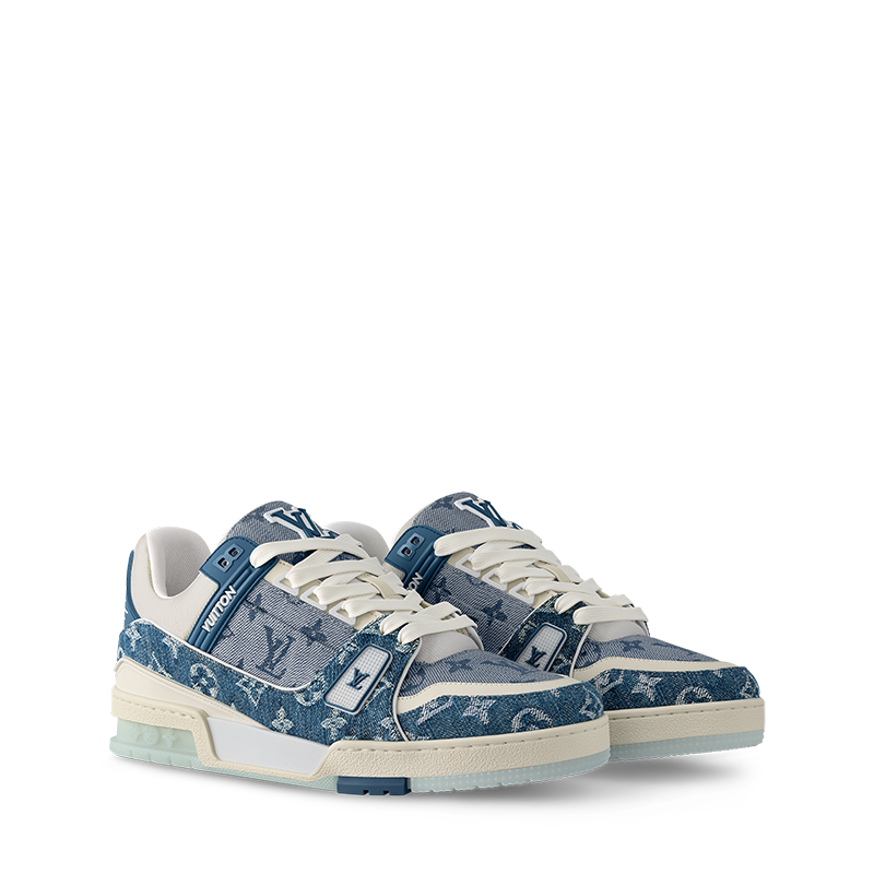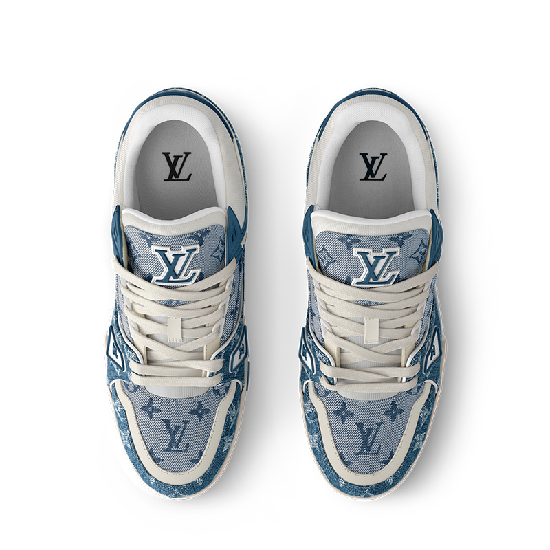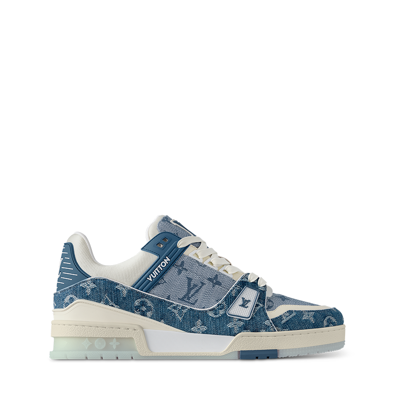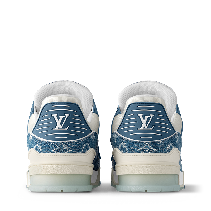This edition of the LV Trainer sneaker combines two shades of Monogram denim for a smart, tonal look. The design is complemented by two-tone laces and rubber signatures, including the LV Initials. Originally designed by Virgil Abloh and inspired by vintage basketball sneakers, this model comes on a technical rubber outsole decorated with Monogram Flowers.