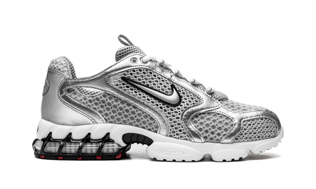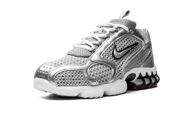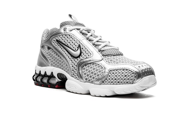 The Metallic Silver Nike Air Zoom Spiridon, commonly known as the Cage 2, features a mesh upper in silver and gray. Along with a black outlined Swoosh logo on the sides, it features patent and metallic silver leather overlays on the sides, toe, and heel areas. The heel sports a red Swoosh logo, while the front has white laces. A clear air cell with a glossy black cage surrounding it can be found at the heel of the white, foam-filled midsole.