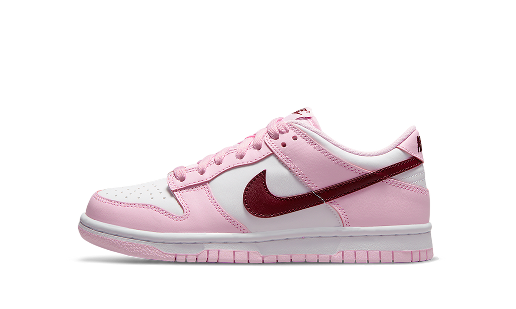 The Nike Dunk Low GS “Pink Foam” is the youth sizing of the colorway of the classic basketball shoe with eye-catching pink accents. The “Pink Foam” features a white leather base with Pink Foam leather overlays. The look is broken up with Dark-Beetroot-colored leather Swooshes on both sides. A Dark Beetroot “Nike” logo appears on the heel and is printed on the tongue tag above a dark red Swoosh. The white midsole is matched with a pink rubber outsole.