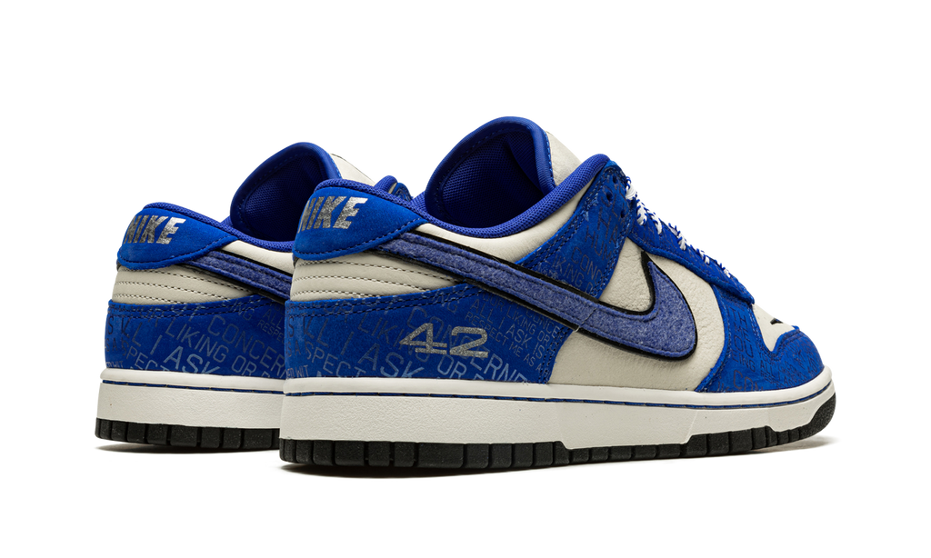 The Nike Dunk Low “Jackie Robinson” is a special edition colorway that honors the life and legacy of the civil rights activist and Baseball Hall of Famer. From Nike’s July 2022 release cycle, the “Jackie Robinson” Dunk Low celebrates Jackie Robinson, who broke baseball’s color barrier in 1948. The colorway takes inspiration from Jackie’s time with the Brooklyn Dodgers, beginning with Racer Blue leather overlays on the toe cap, forefoot, eyelets, collar, heel, and Swoosh, all of which are inscribed with inspirational quotes by Jackie. The leather base appears in a cream-grey hue. Together, the two colors are inspired by the Brooklyn Dodgers’ old team uniform colors. Other overtures to Jackie’s time on the ballclub include his “42” jersey number on the heel. A commemorative “75th anniversary” patch appears on the tongue as a salute to Jackie’s arrival in Major League Baseball in ‘48