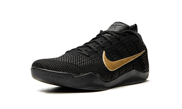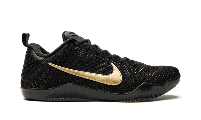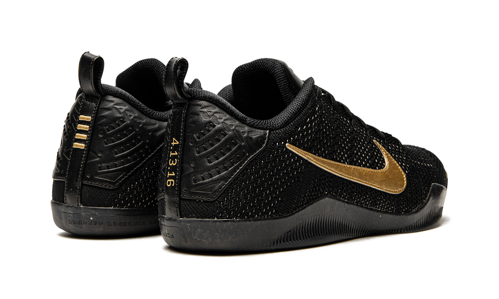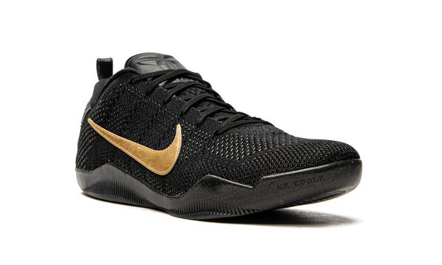 This special limited edition of the Nike Kobe 11 was included in Nike’s “Fade to Black” collection of Kobe Bryant signature sneakers commemorating his final season. Beginning with a cream white color for the Nike Kobe 1, each Kobe model within the collection slowly transitioned to grey and then black. As the Kobe 11 was his final signature model at the time, it’s the one that received a pure black look.The entire upper and sole are black, while metallic gold Swooshes and details on the heels add the perfect touch.