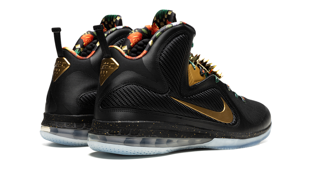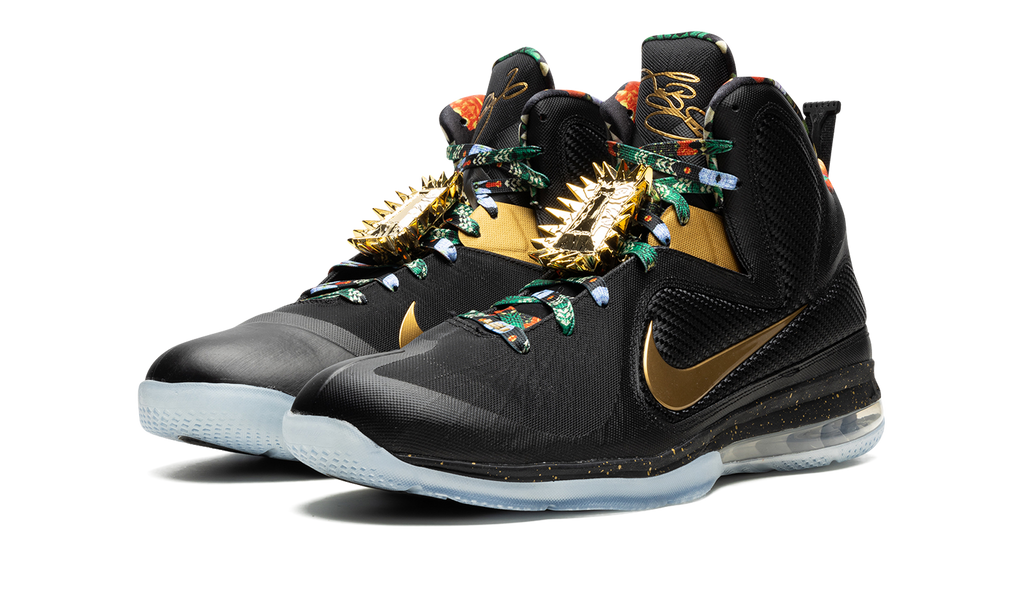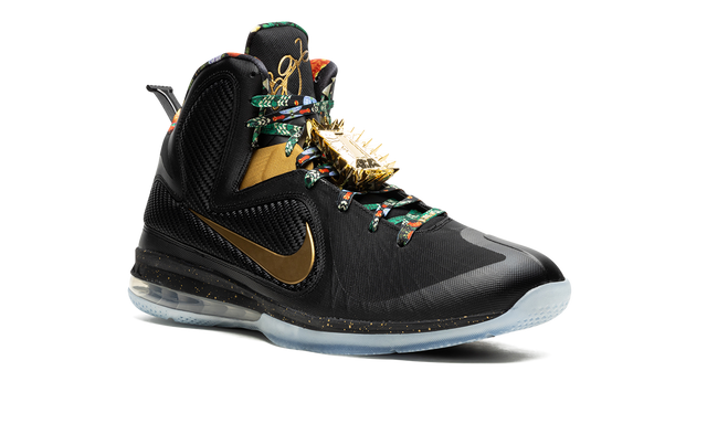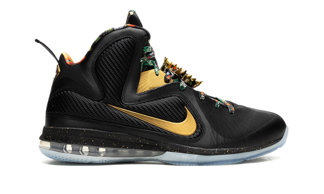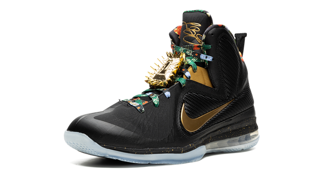 The Nike LeBron 9 “Watch the Throne 2022” is the modern re-release of the popular colorway of LeBron James’s ninth signature shoe with Nike Basketball. This colorway was originally a “Friends & Family” colorway of the performance basketball shoe created exclusively for LeBron and close family and friends. The “Watch the Throne” LeBron 9 is inspired by Jay-Z and Kanye West’s 2011 “Watch the Throne” studio album, specifically its luxurious album artwork, which was designed by fashion designer Riccardo Tisci. The shoe was given a general retail release for the first time ever in January 2022. Details include a Metallic Gold Swoosh on either side of the black Hyperfuse upper, which is stabilized with interior Flywire cables and textile wings. Both the interior lining and laces have a premium-inspired multicolor design. LeBron James’s signature appears in gold on the top of the tongue and gold-plated lace “jewels” are found on the mid-section of the tongue, partially obscuring the laces. Additional gold accenting is found in a speckle-like finish on the black foam midsole above the 180-degree Max Air cushioning unit underfoot. Release date: Release date: January 6, 2022