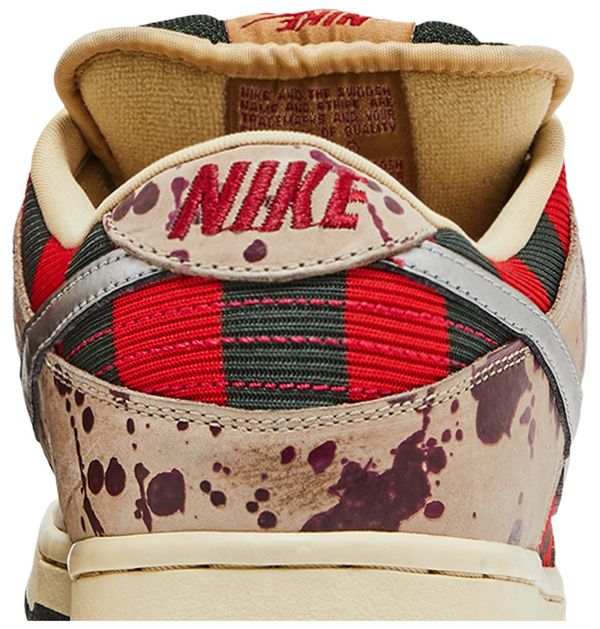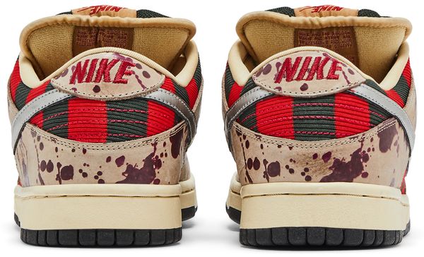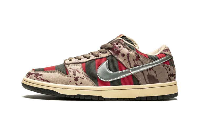 With the Dunk Low Pro SB ‘Freddy Krueger,’ Nike pays tribute to the villain that haunts the Nightmare on Elm Street film franchise. Freddy’s signature striped sweater is replicated on the low-top’s two-tone textile base, while blood-splatters stain the beige leather overlays. A metallic silver Swoosh gives the nod to the razor-sharp blades that extend from Freddy’s leather glove. This Dunk was never officially released to the public and only existed in sample form.