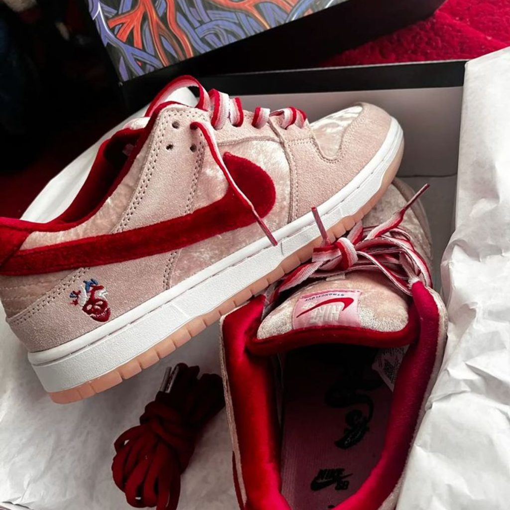 The StrangeLove Skateboards x Nike SB Dunk Low is a special colorway designed in collaboration with the underground skate brand to celebrate Valentine’s Day. Holidays have traditionally served as a source of inspiration for Nike SB and their venerable Dunk dating back to the mid-aughts heyday of the shoe. That tradition continues with this premium Dunk Low. Heartwarming hues of pink and red encompass the upper of the low-top Dunk, which include a red velvet Swoosh and light pink velvet overlays on the forefoot and heel. StrangeLove’s logo is embroidered onto the heel, and it also appears on the white nylon tongue tab. A white midsole and translucent pink outsole with red and blue hearts visible underneath completes the unique design.