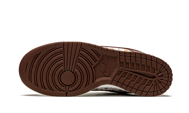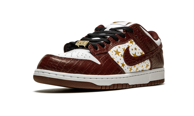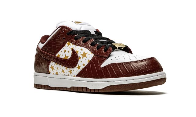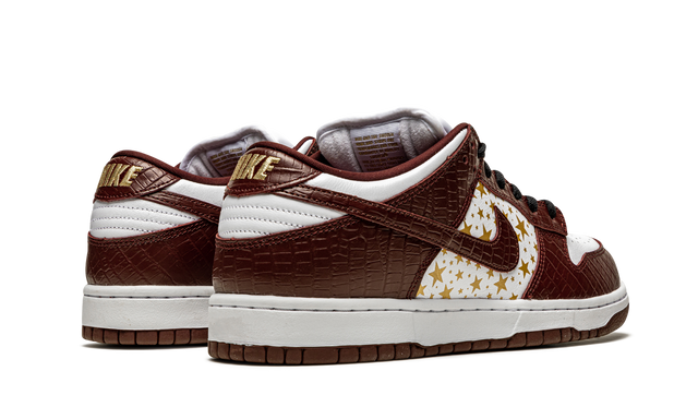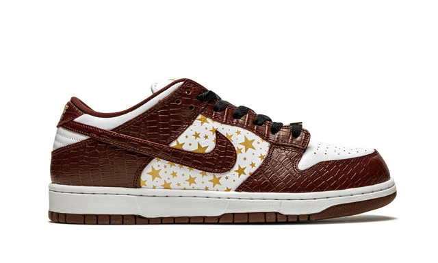 The Supreme x Nike SB Dunk Low “Stars – Barkroot Brown” is a collaboration between the New York City based streetwear brand and Nike SB that puts a premium spin on the popular skate shoe. One of four colorways released in March 2021, the “Stars – Barkroot Brown” mimics the unique styling of Supreme and Nike SB’s second-ever collaboration from 2003. Like the “OG” collection, the modern release features faux crocodile-texture leather panels on the forefoot, eyelets, collar, heel, and Swoosh. A crisp white base on the perforated toe and on the mid-panel and collar allows the for the croc-textured panels to attract attention. Additionally, the metallic gold “stars” motif printed on either side of the shoe is reminiscent of the look of the original “Stars” colorway designed by Supreme. A metallic gold Supreme emblem sits on the black laces of the white mesh tongue and a gold embroidered Nike logo is stitched onto the back of the shoe. Release date: March 4, 2021.