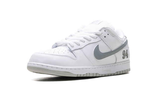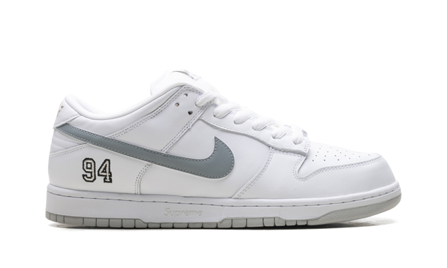 The Supreme x Nike SB Dunk Low “White” is one of five colorways that the streetwear brand released in spring 2025. Anytime Supreme releases a Dunk, it’s a big deal, and this 2025 collaboration is no exception. The “White” colorway of the Supreme Dunk features a smooth white upper that is accented with a reflective silver Swoosh that adds contrast. The number “94” is embroidered by the heel in a style that is reminiscent of Michael Jordan’s “23” that appears on certain Air Jordan 5 models. The “94” is a nod to the year Supreme opened, and the brand’s logo is also debossed on the midsole.