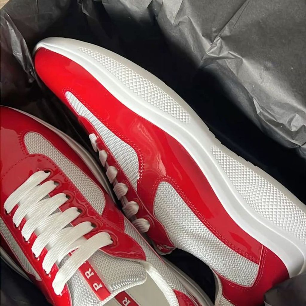 Introducing the Prada AmericaRed Silver s Cup Sneaker. This stylish and trendy sneaker from Prada features a sleek red and silver color combination that is sure to turn heads. With its comfortable fit and high-quality construction, this sneaker is perfect for any casual or sporty occasion. Step out in style with Prada’s AmericaRed Silver s Cup Sneaker.