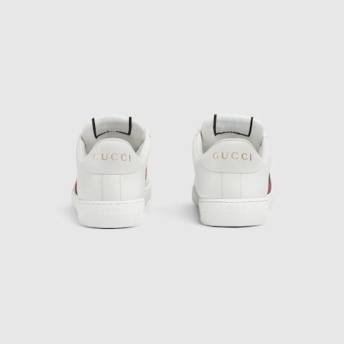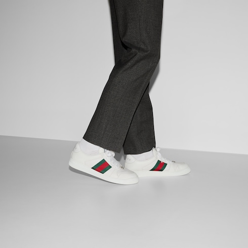 Influenced by classic sneakers from the 1970s, the Screener sneaker is named for the defensive sports move. Here the emblematic style is presented in white leather with an embossed GG leather insert