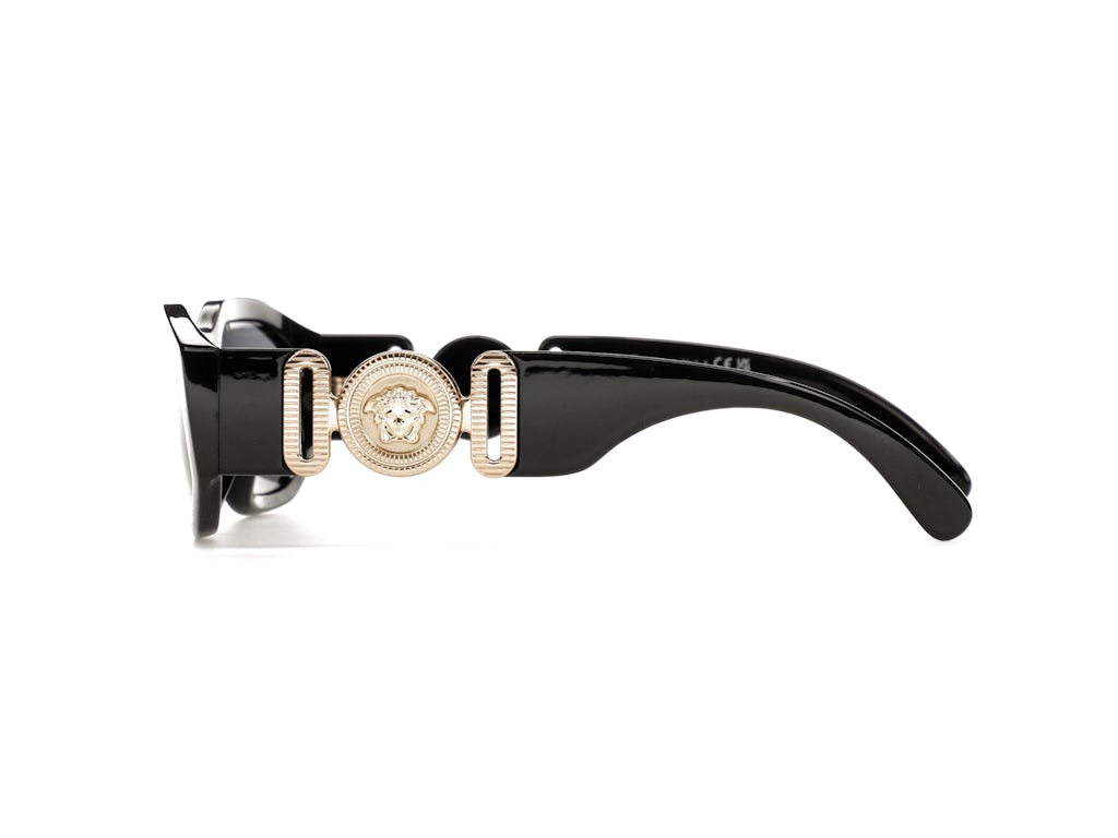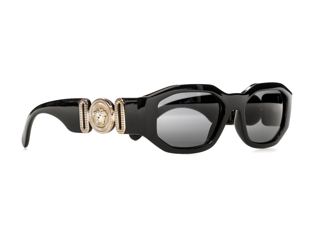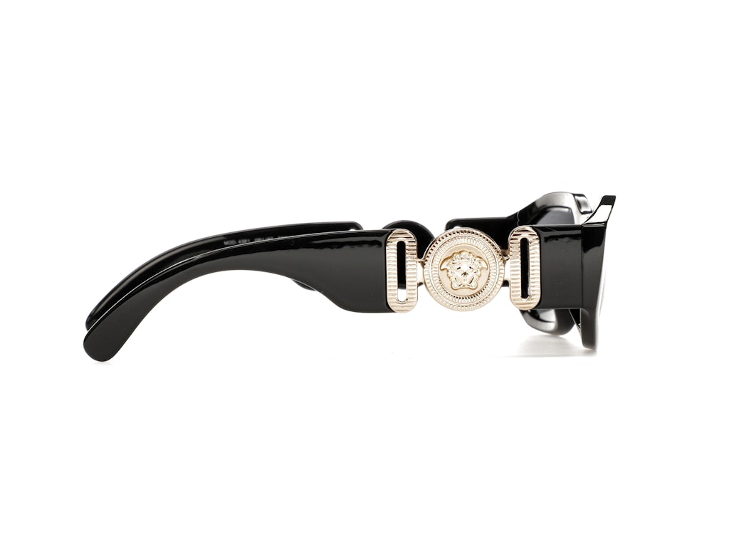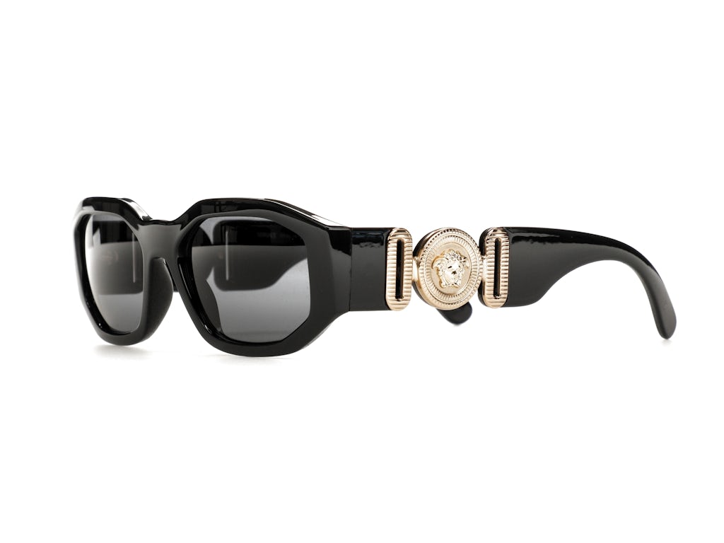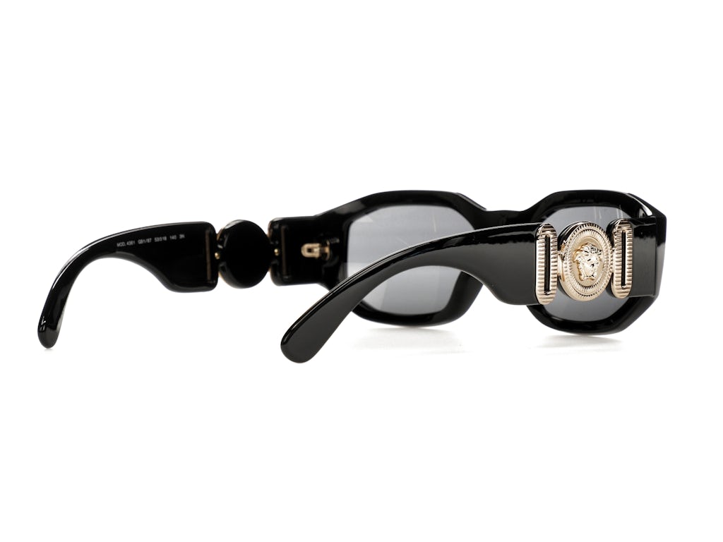 Our team likes the thickness of the eyeglass frames on the Versace Irregular Biggie Sunglasses, Black/Black (VE4361). We are also enthused with the black/gold color combination and the placement of the gold Medusa Medallion on the temples. The Medusa Medallion is the official Versace logo. When they were released, the original retail price was $345.