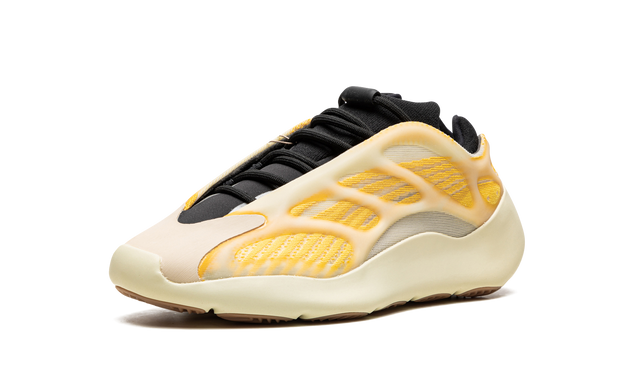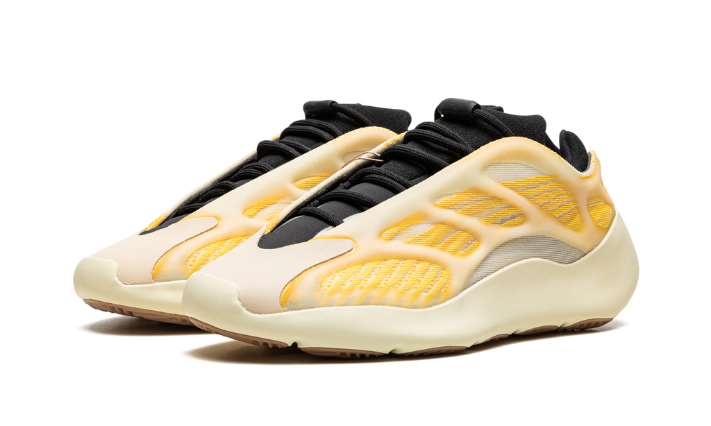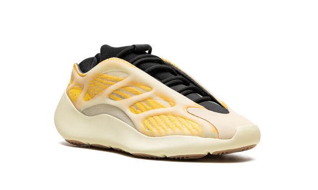 The adidas Yeezy 700 V3 “Mono Safflower” is a March 2022 release of the third variation of Kanye West’s lifestyle shoe. The colorway is a follow-up to the Yeezy 700 V3 “Safflower,” which like the “Mono Safflower,” features a yellow-based appearance, albeit slightly lighter in hue than this edition. The shoe’s sock-like upper features contrasting dark yellow and grey stripes beneath the TPU overlays that provide support. A black neoprene tongue and collar are arranged in a bootie-like construction for additional support. The shoe rides on a lightweight foam midsole and rubber outsole in a cream finish. Release date: March 18, 2022